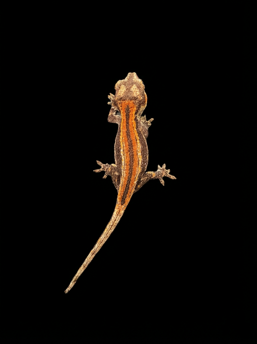 GooglePayThis baby features a striking, thick orange stripe running down the center of the back that immediately grabs your attention. The base color is a dark, earthy brown that creates excellent separation and contrast against the bright dorsal markings. The side patterning is subtle but detailed, keeping the focus on that bold top stripe.