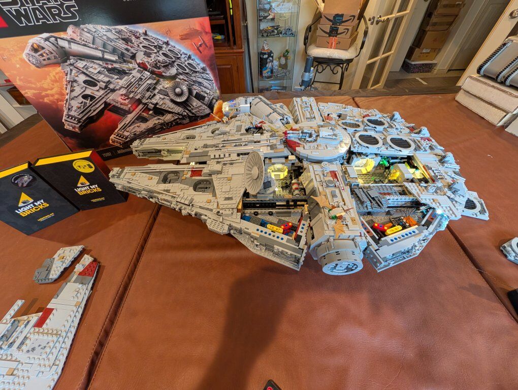 This has been my baby for a long time now as I have installed LightMyBricks full light and sound system into this falcon. I have more videos if interested. Alongside that upgrade, I have added pieces to make this more screen accurate like the cockpit is more detailed with the centerpiece in between the two wings on the front inside that fills in the pointless hole and added lights for more detail. Every upgrade is removable to make it back to the factory condition if you wish. I just wanted to make the small details pop more on this compared to factory. This set comes from a smoke-free environment. I kept it covered by a UV protector so the set didn't fade. I have all the Minifigures (also an extra Mynock: flying bat creature from Empire Strikes Back), the original package, manuals, everything!