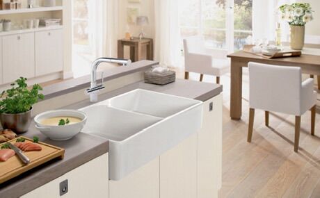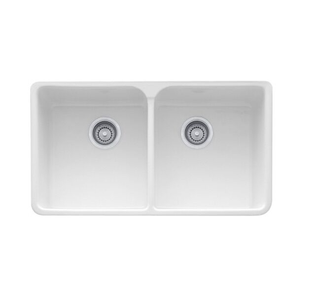 35.5-in. x 21.62-in. Ceramic Double Bowl Apron Front Kitchen Sink, White. Many handcrafted Franke Fireclay sinks are designed in partnership with Villeroy & Boch, a world-renowned premium porcelain and ceramic producer since 1748. Together, Franke and Villeroy & Boch created the distinctive design of the Manor House Collection to enhance your personal kitchen style. Scratch-and-stain resistant fireclay offers hygienic properties and qualities most desired in today's kitchens.