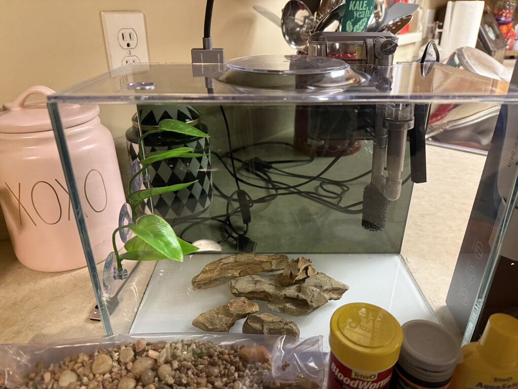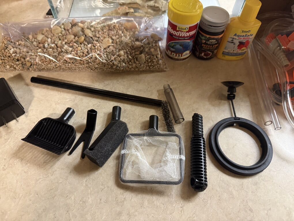 EXTRA: -siphon to clean out water and gravel -betta food -betta snack (blood worms) -water conditioner -feeding ring (so food doesn't go to and stick to side of tank) -3 beta leaf hammocks ($45+ value)