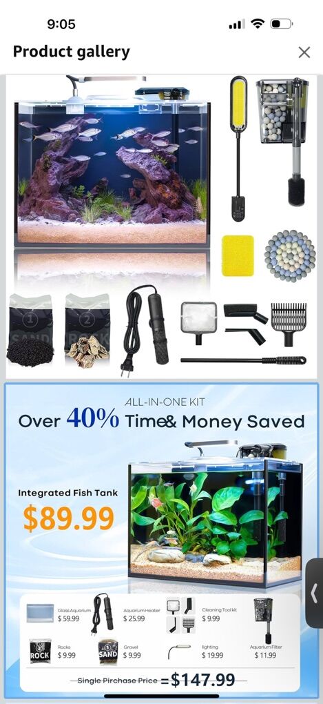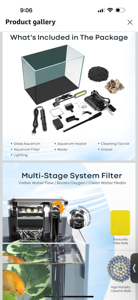 -5 gallon tank -Filter (Detachable) -light (Detachable) -heater (Detachable) -Decorative rocks  -gravel -fish net -gravel rake for cleaning -sponge to clean sides