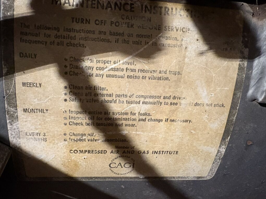 CashApp5 hp electric motor 80 gallon tank 150 psi I think it’s a 16 CFM 220 v single phase compressor never run out of air I wouldn’t be salting it but owe back taxes on my property saleing cheap for only $2000 comes with water separator , it has fan belt guard and runs great paint cars , sand cars , run any air tools etc