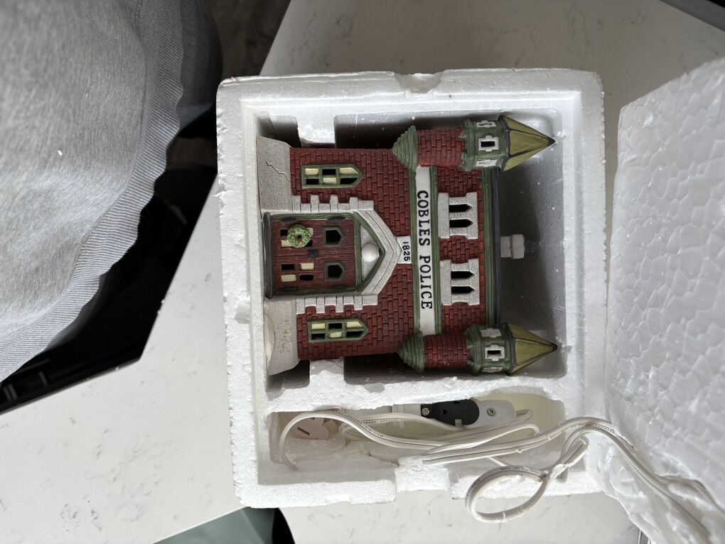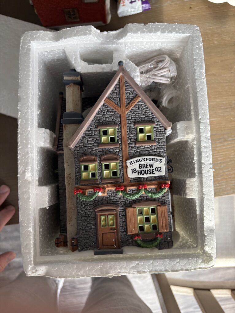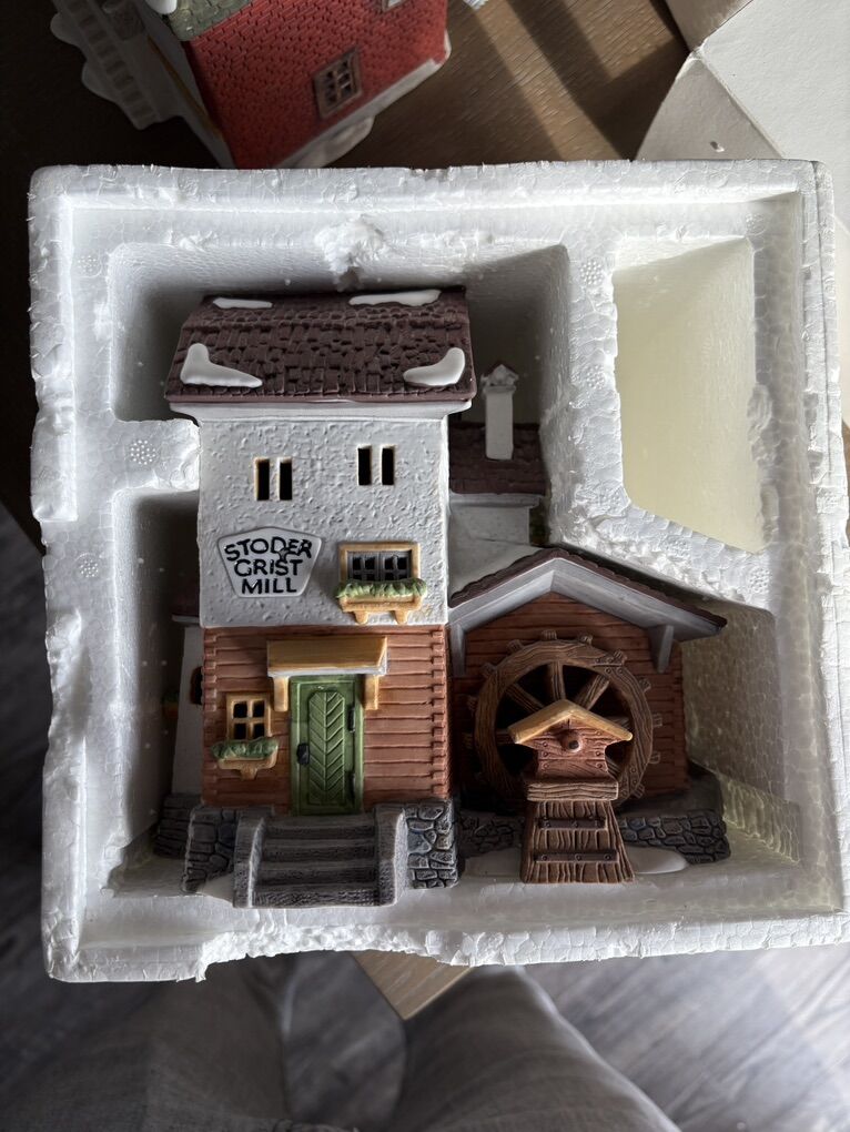 Hather Harness - 35 Poulterer - 25 Flat of Ebineezer Scrooge -35 C H Wyatt Physician- 30 Police Station 40 Christmas Carol Morning- 15 Christmas Carol Spirits 25 Nottingham Church 40 Browning Cottage 30 Victoria Station 75 Dashing through the snow 20 Postern 20 Brewhouse 35 Chelsea Market Figurines 15 Grist Mill 30 Kings Road Cab 15 Trotwoods cottage 35 Fezziwigs 35 All other figurines and accessories 75