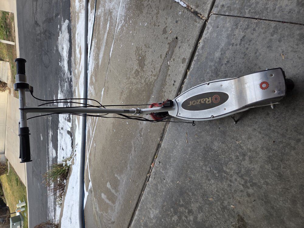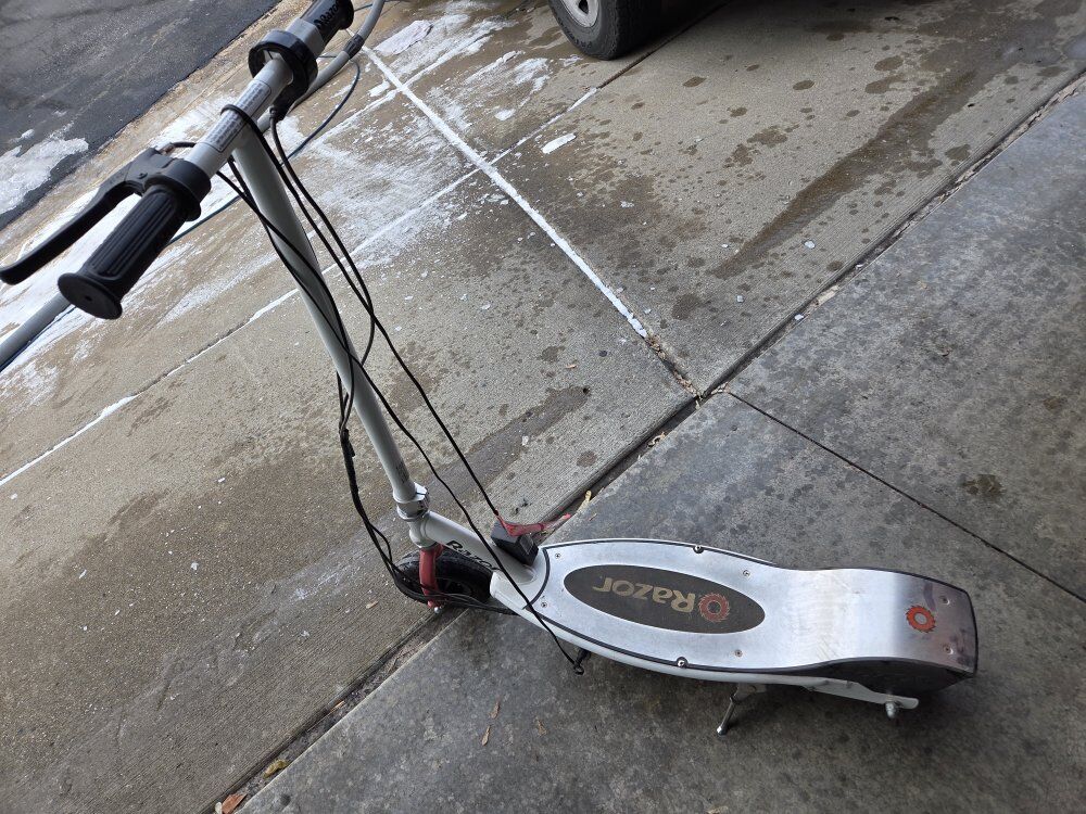 PayPalElectric Scooter used 1 yr. Excellent battery Razor® E200 Electric Scooter. Designed for riders 13 and up, it reaches 12 mph as you accelerate around town with twist-grip controls and a high torque, chain driven motor. The large 8” pneumatic tires and 24V rechargeable battery system ensure you have up to 40 minutes of continuous smooth riding.