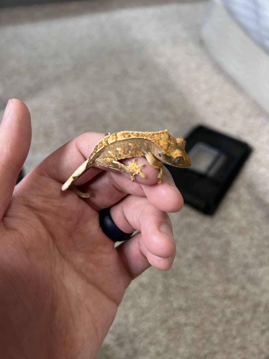 VenmoBaby crested gecko. Hatched: 11/19/25 Weight: 3 grams Diet: Feeding on Repashy and Pangea crested gecko diet. This one is developing a nice, partial pinstripe pattern on the back.