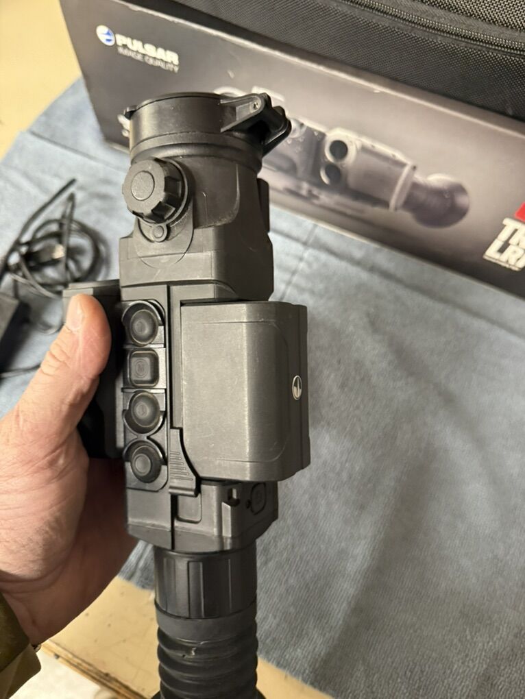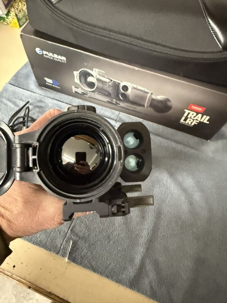 Pulsar trail xp50lrf original owner great scope with laser rangefinder. Big ISO 14 battery runs all night bobro quick attach cantilever mount comes with all original packaging hardware. 2600