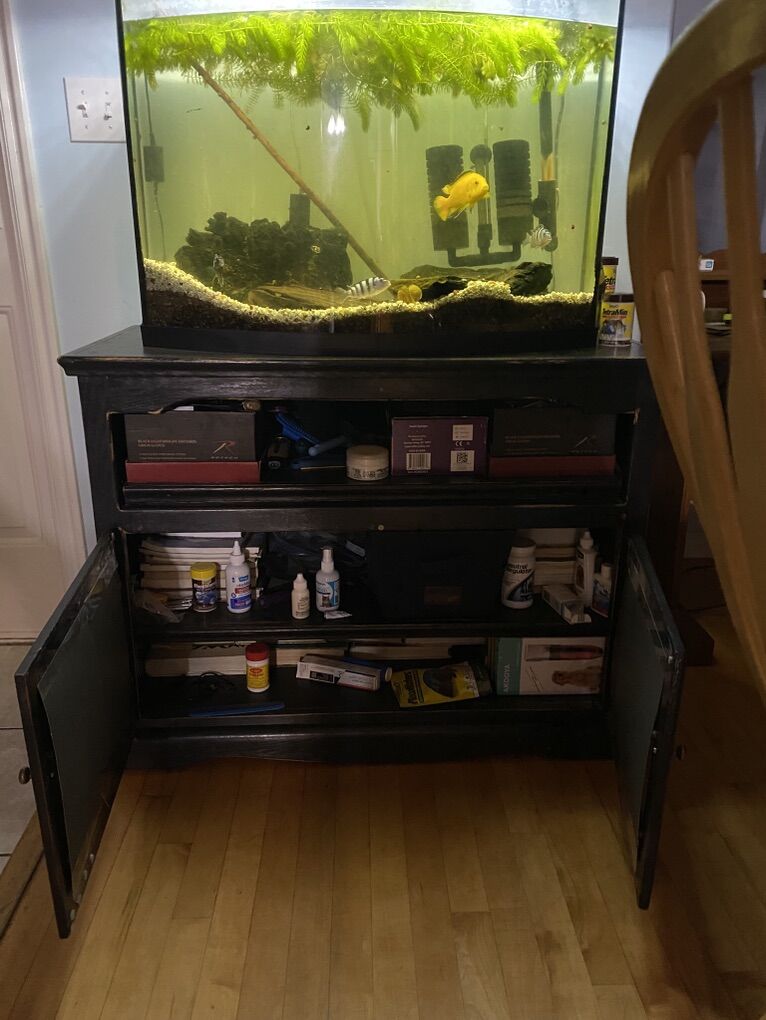 Venmo49 gallon curved front fish tank with four cichlids. Three blue striped ones and one yellow one. Fish are healthy, and the tank is well-established. Includes water, filter, heater, all supplies, rocks, and decorations. Stand is solid wood with glass cabinet doors. Tank with fish is $100. Stand is $100. Son is selling to help pay drill team fees. Pick up in West Haven. Bring some five gallon buckets for the water. Can deliver in the Ogden to Layton area for a little extra.
