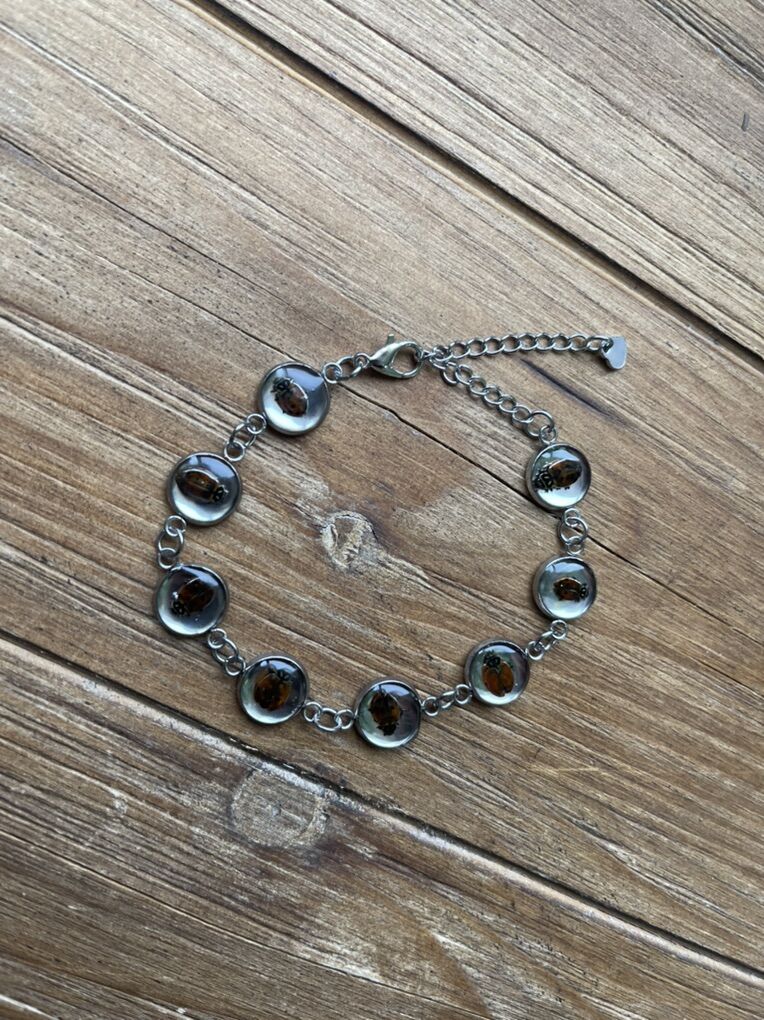 Details: • 7 encased ladybugs • Silver-tone chain • Adjustable clasp – fits most wrists • Lightweight and comfortable for everyday wear • Each piece is naturally unique