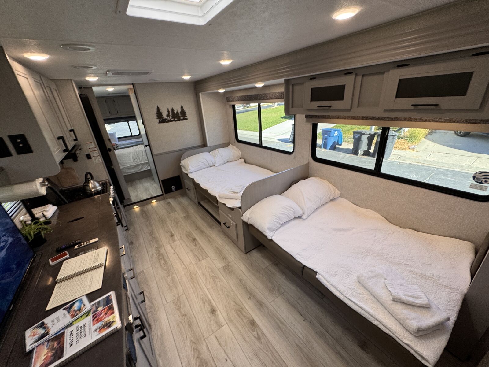 All of our RVs are fully stocked so you can hit the road without the stress: • Bedding provided for the master bed • Cooking + camping essentials included • Clean, ready, and easy to use