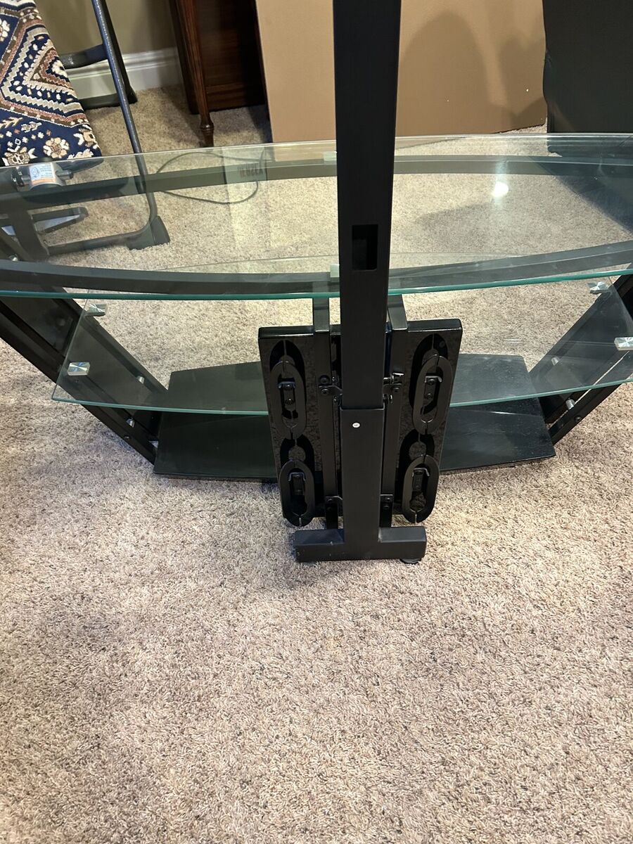 VenmoModern black glass TV stand with built-in TV mount. Sturdy metal frame with two glass shelves and a sleek curved design. The integrated mount fits most flat-screen TVs (VESA compatible) and allows for a clean, space-saving setup—no wall mounting required.