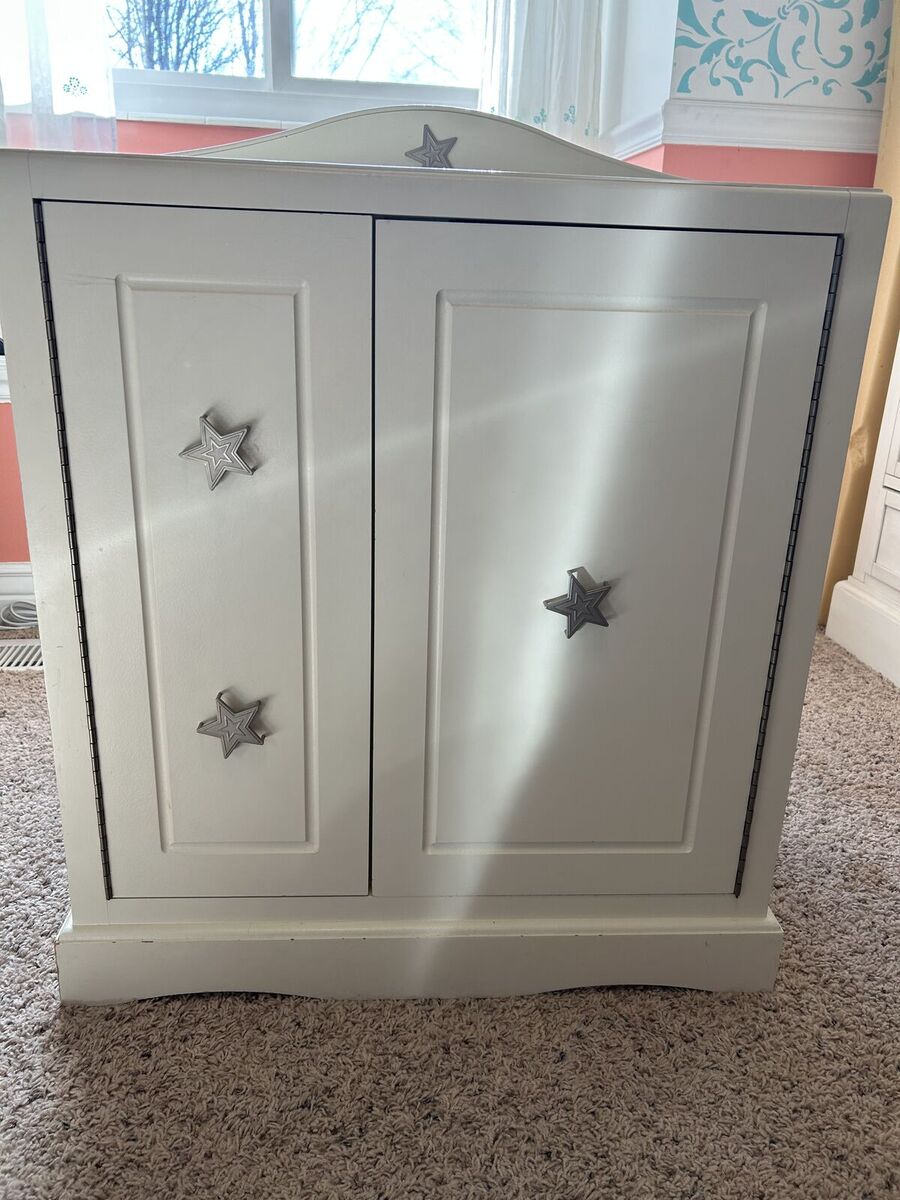VenmoLooking for the perfect storage solution for your American Girl doll clothes and accessories? This charming American Girl doll wardrobe is just what you need! Featuring a classic white design with silver star accents, it's both stylish and functional. Details: Two doors with a cute star design for a fun, fashionable touch Spacious interior with shelving for organizing doll clothes and accessories Solid construction and sturdy design, made to last In excellent condition with minimal signs of use Ideal for storing American Girl doll clothing and accessories