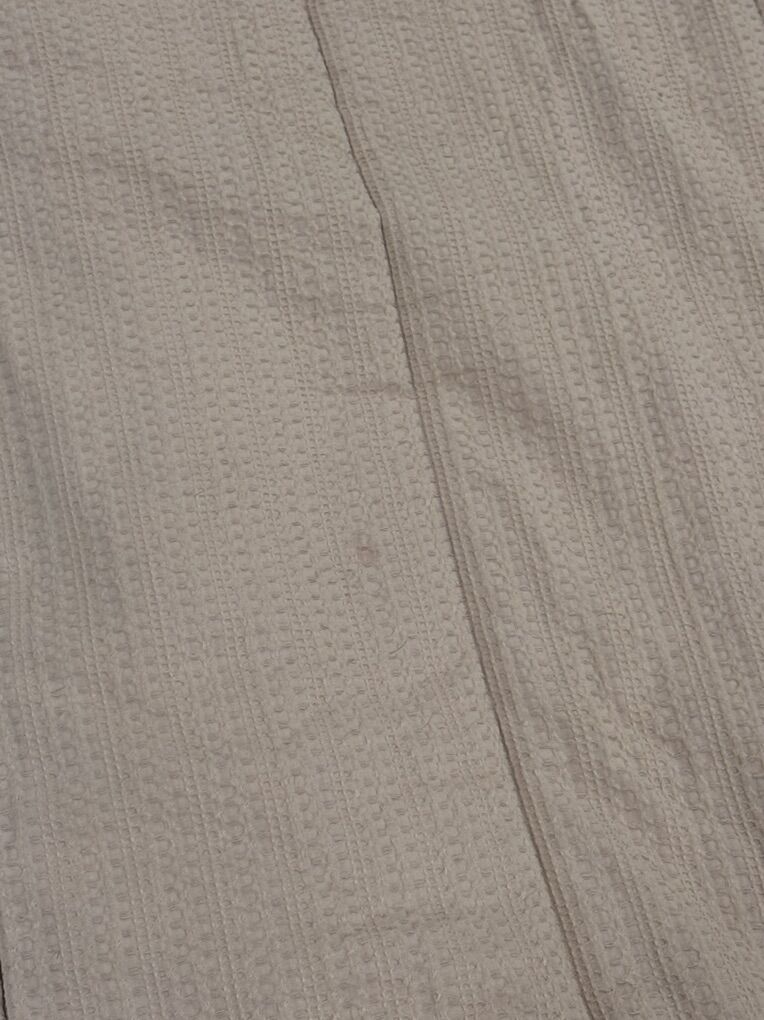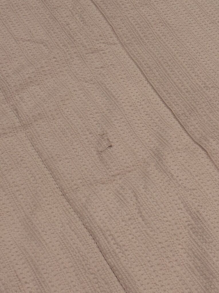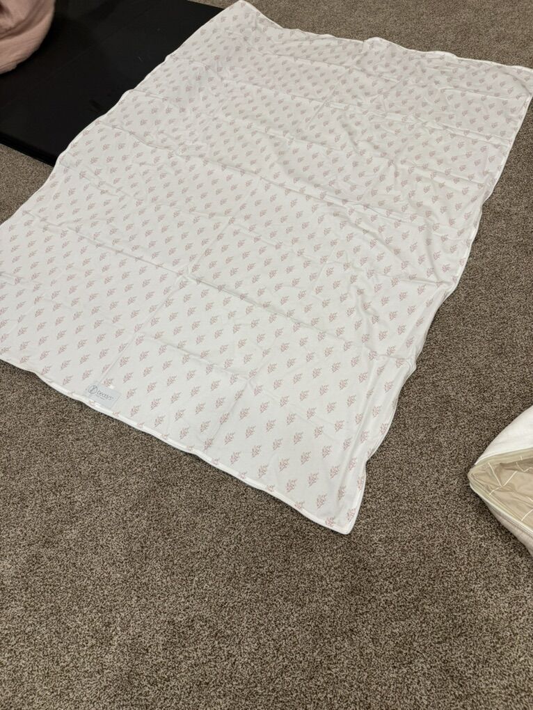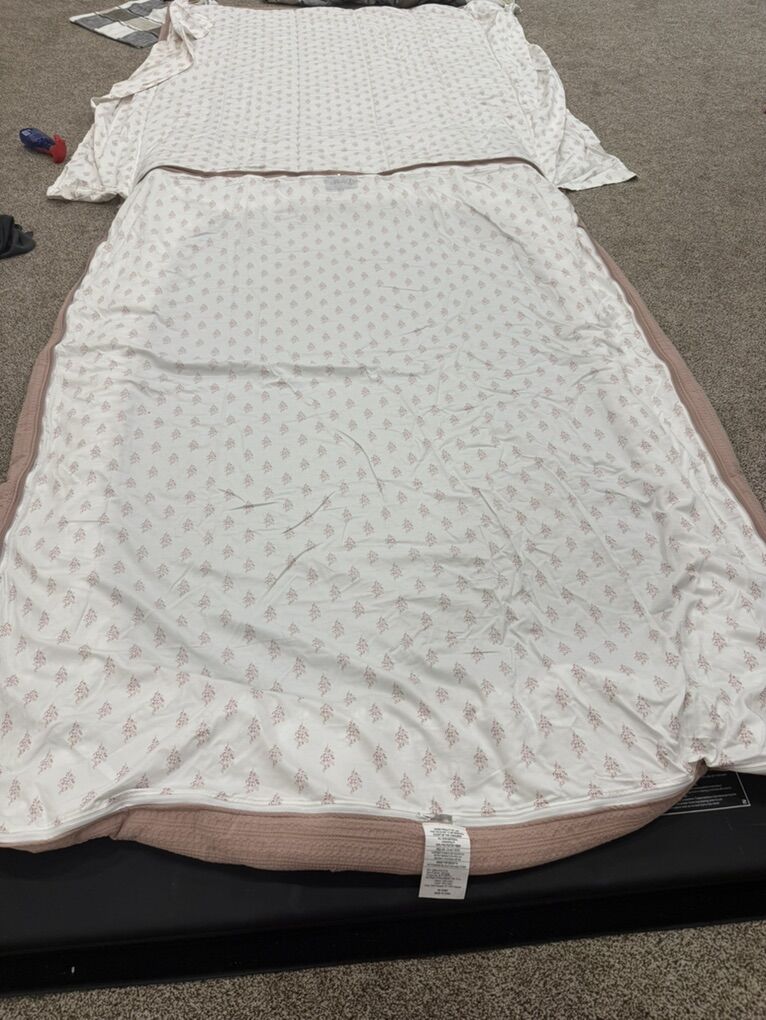 Queen Alexandria Cotton Zipbase. Has 2 shams and 2 cases and 2 sheets. One sheet has faint stains. Top has a small L shape rip and a small loose thread (tiny hole) shown. Small pink mark on top. JAN45