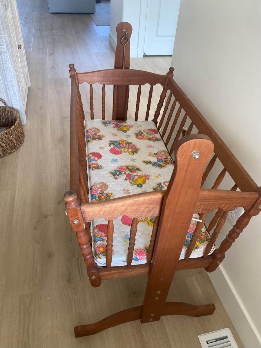Very sturdy, has a pin that can be used to stop rocking when wanted. Comes with a mattress pad.