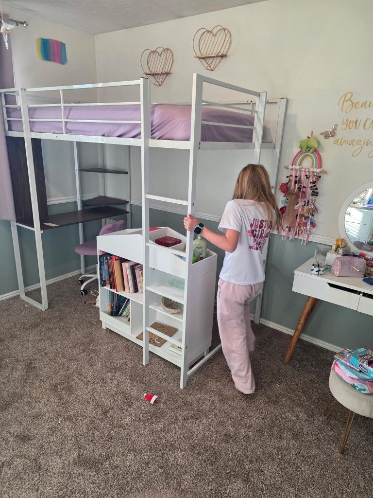 VenmoWhite twin loft bed with desk. In good condition, one shelf needs repair (see photos) but we used a block to prop it up & it was fine. Dimensions are 71" tall x 77" long & 40" wide. Asking $100, cash or venmo only. Also have clean like new twin mattresses for $50