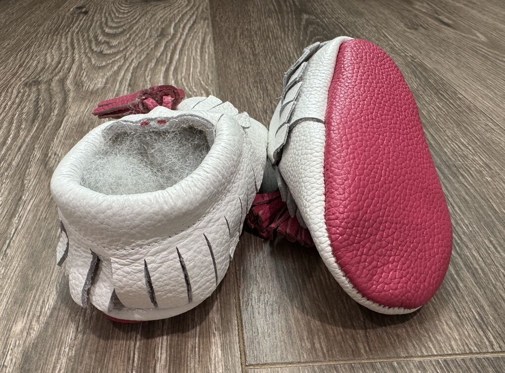 VenmoAdorable white/pink baby girl moccasins, never worn. Approximately 5 inches long. Lightweight and easy to put on, great for little ones who are crawling or just starting to stand.