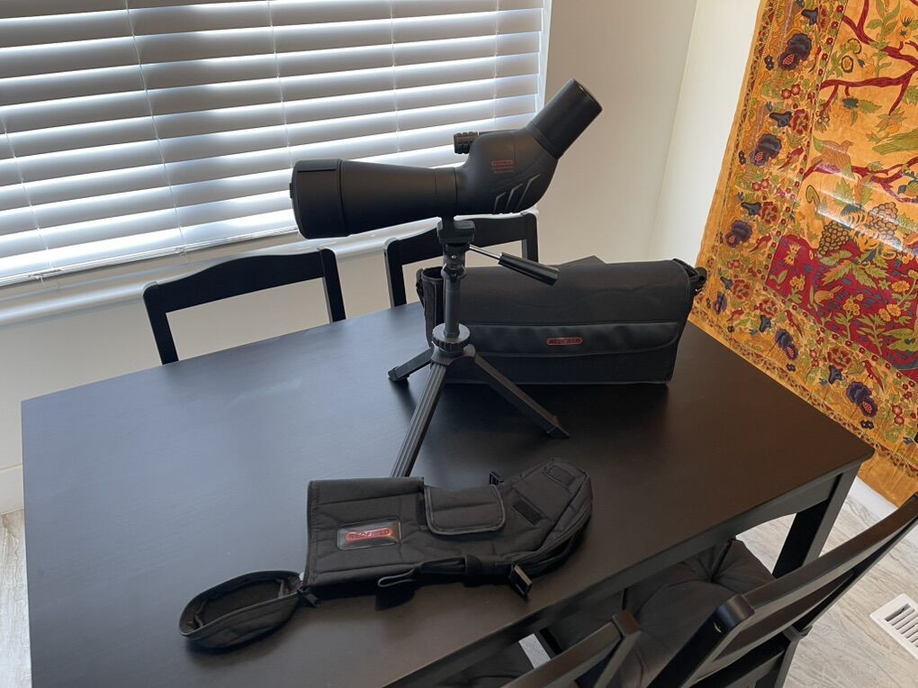 Like brand new, no scratches, perfect lenses, bench, top tripod, padded protective case and carrying case.