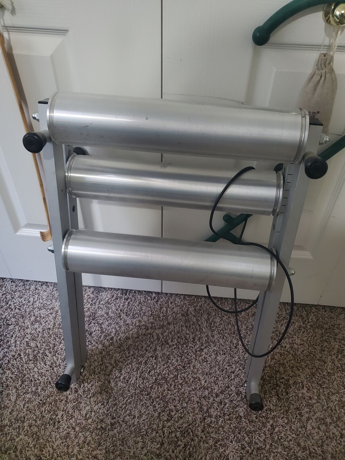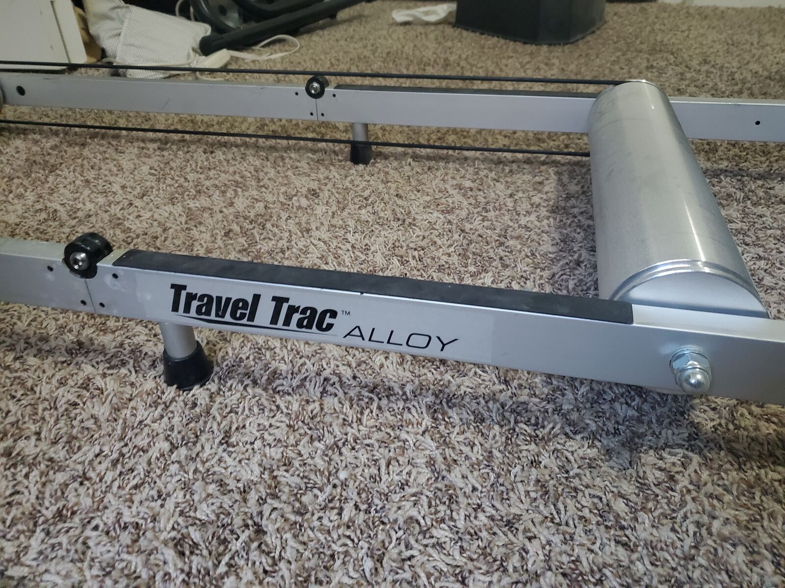 Travel Trac roller trainer features alloy drums and lightweight aluminum frame that folds for easy storage and transporte