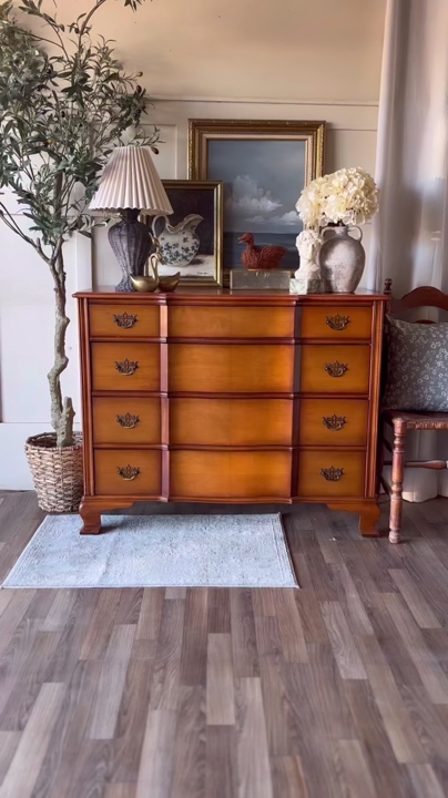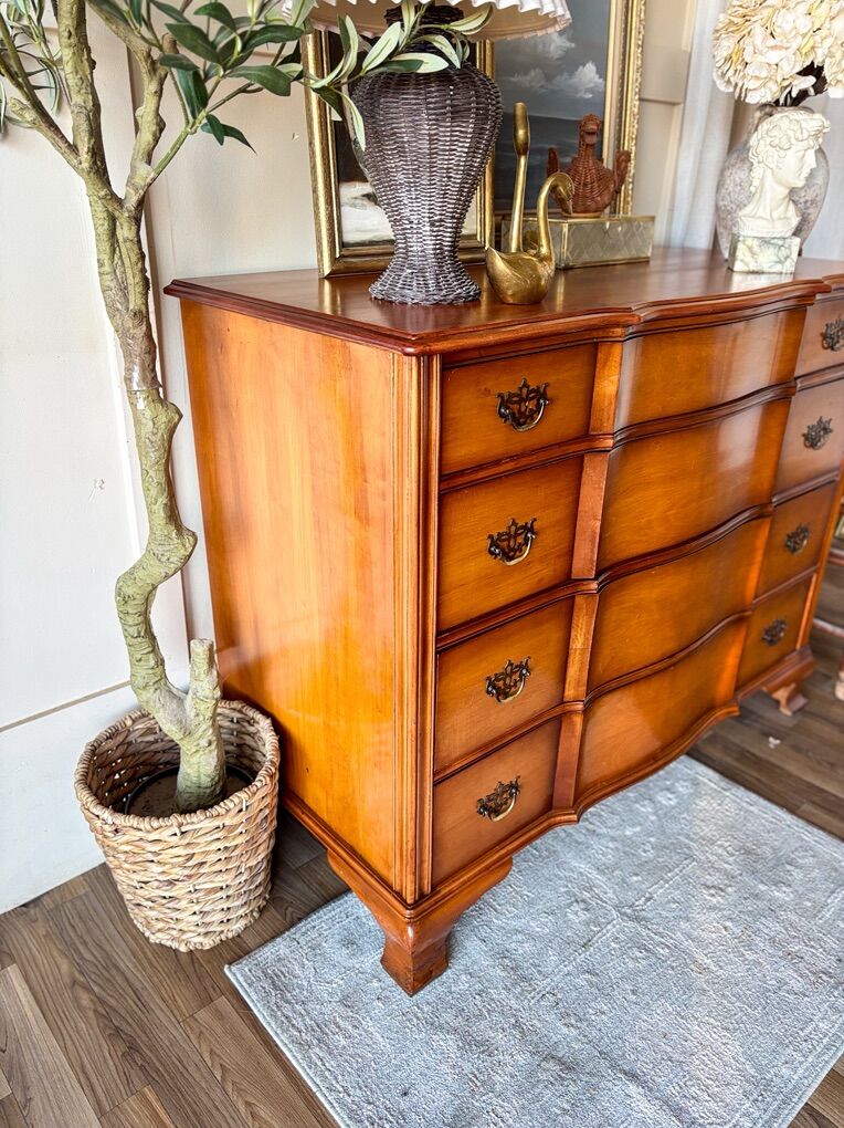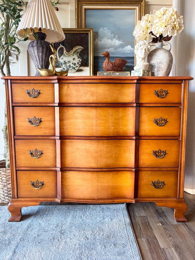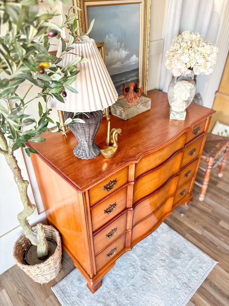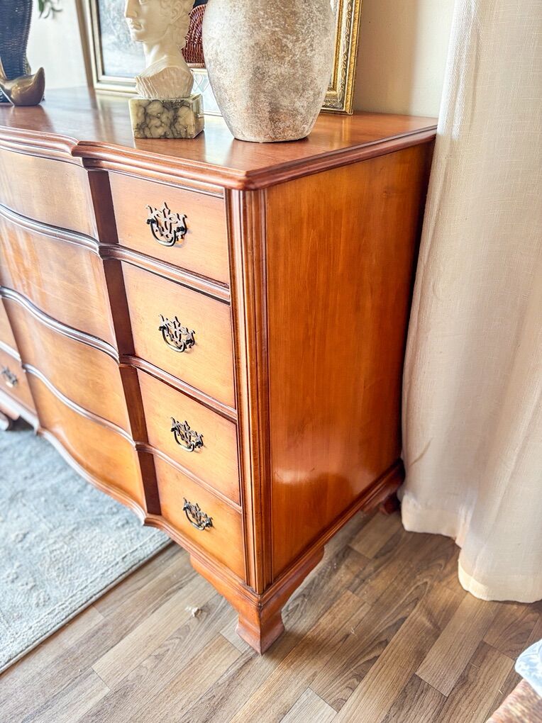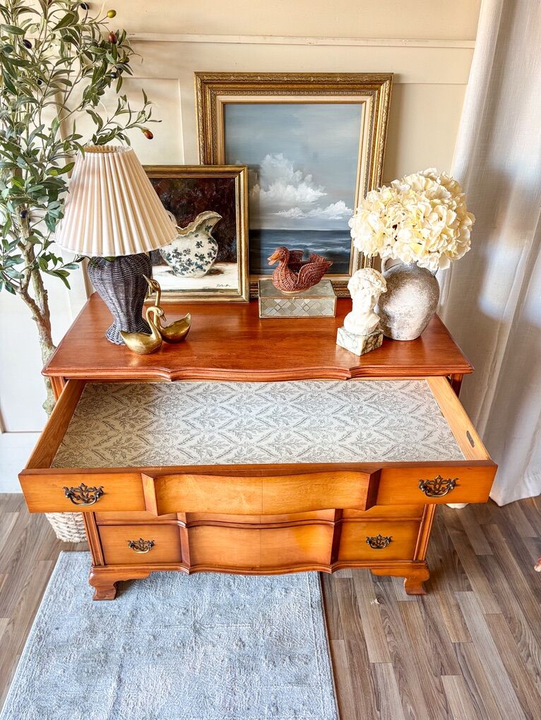 VenmoThis beautiful dresser showcases classic mid 20th century craftsmanship with its original hardware and dovetailed drawers that glide smoothly on traditional wood slides. It has wear throughout that adds character while remaining in good, sturdy condition. The top has been refinished and sealed with lacquer for a clean, refreshed look, and the top drawer is wallpapered. This piece offers timeless charm and everyday functionality!