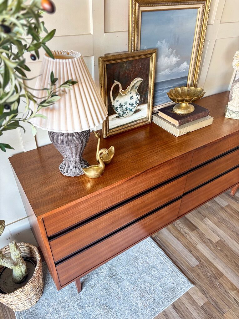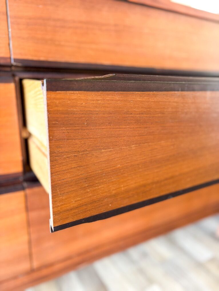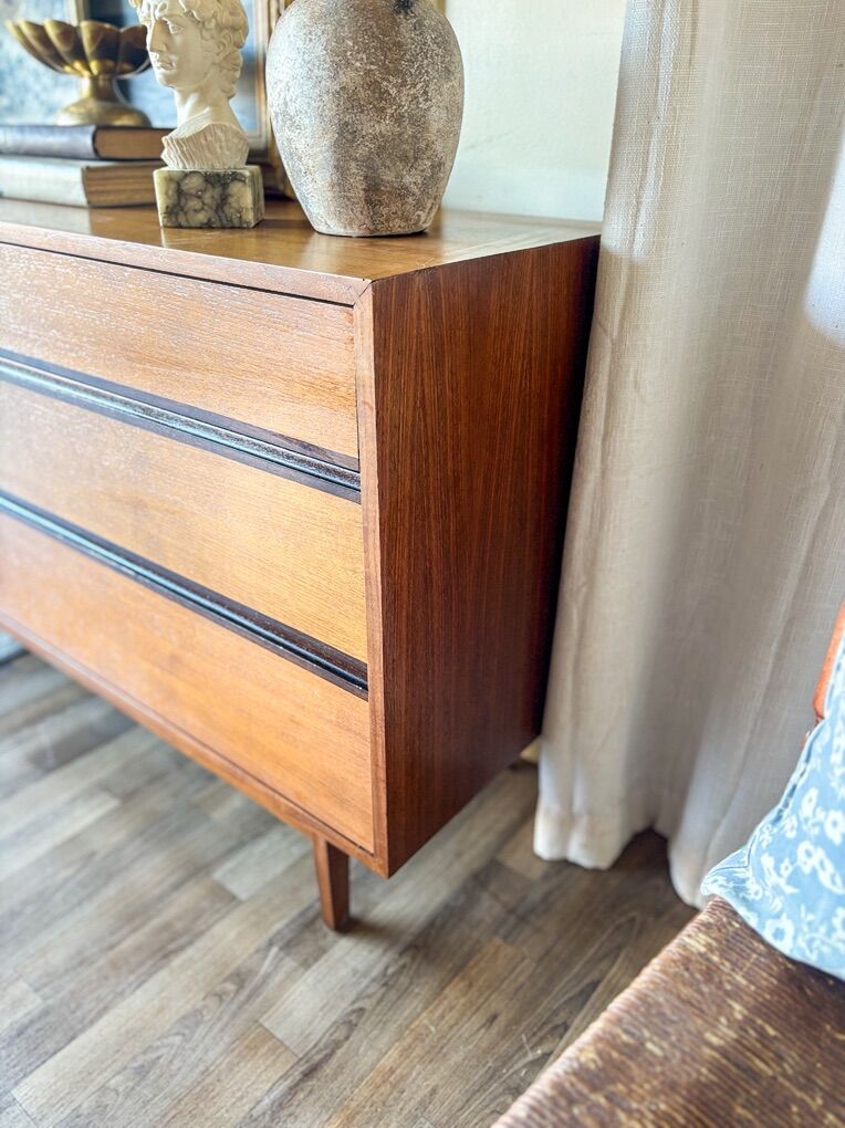 VenmoThis mid century modern American Design Foundation walnut low dresser is a fantastic example of clean lines and thoughtful design from the golden age of modern furniture. Crafted in rich walnut, it features six fully functional drawers that open and close with ease, uniquely constructed with side rails rather than the more common bottom wood rail, an eye catching detail that highlights its smart, mid century engineering. The top two drawers are lined with beautiful wallpaper, adding a fun and unexpected pop of character. Remaining in original vintage condition, the piece shows minor wear consistent with age, including a few small chips and some corner chips on select drawers (please see photos), all of which add to its authentic charm. Stylish, sturdy, and full of personality, this dresser is both a practical storage piece and a true mid century statement!