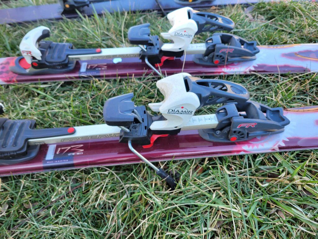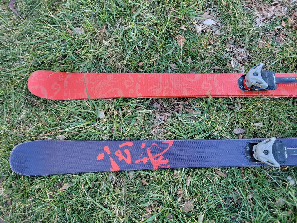 Alpine touring skis with Fritschi freeride bindings! heel lift can adjust to various heights for climbing.