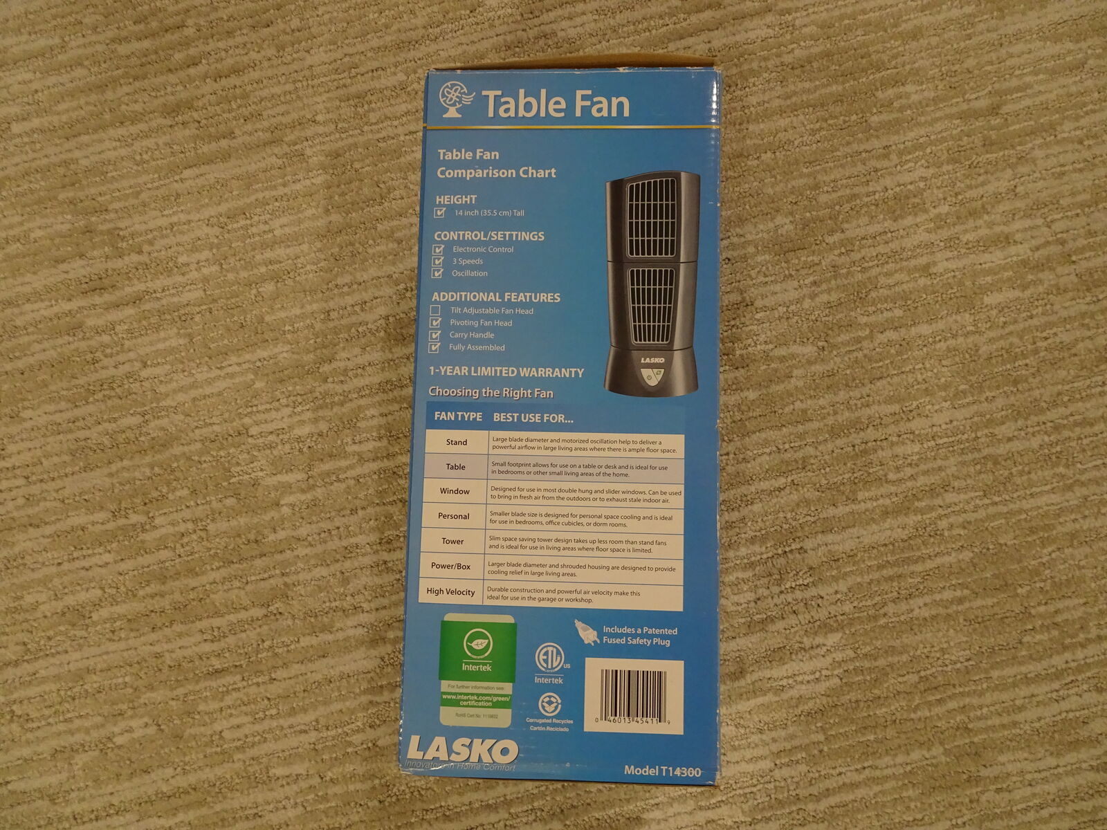 VenmoLasko 14 inch Wind Tower Oscillating Table Fan. It is in excellent condition and comes with the original box,