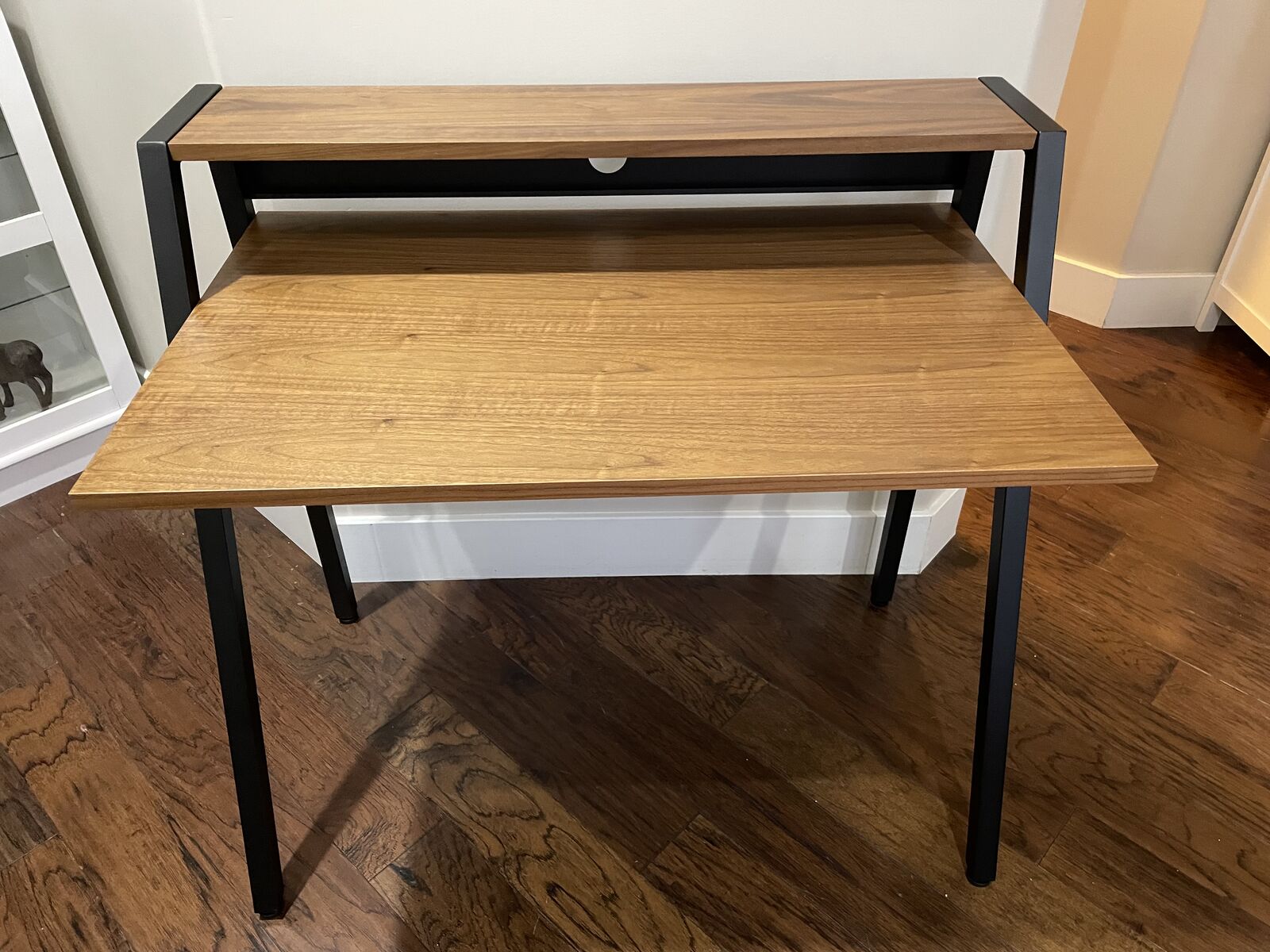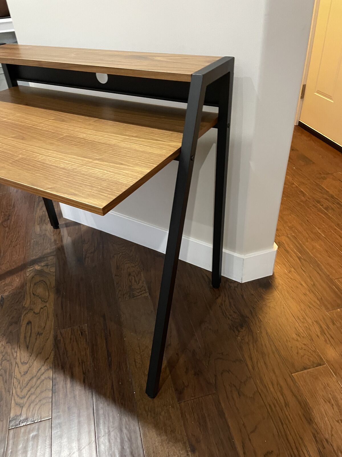 Simple industrial-style design 2-level work area Generous writing surface with room for a laptop or tablet Upper shelf for additional items Access point for cable management This sleek and stunningly simple writing desk offers two levels of work areas and a modern, space-saving design, making it a great option for the office, home or dorm room. The industrial-style desk features a generous writing surface with room for a laptop or tablet and other essentials, an access point for cable management and an upper shelf for smaller items. Width37.75 in