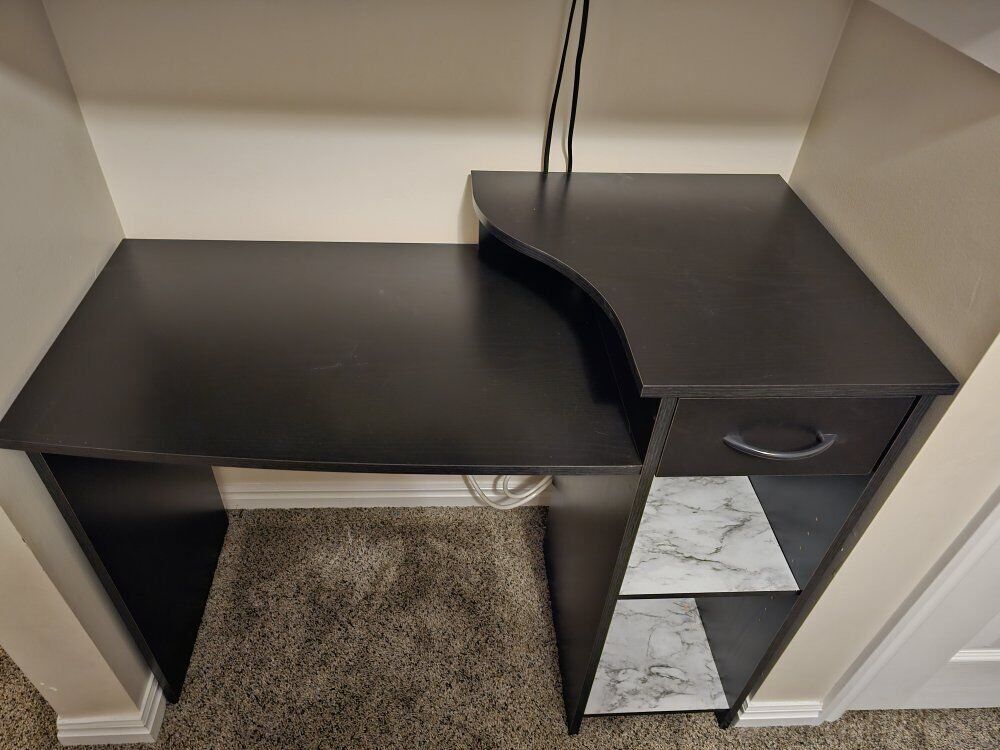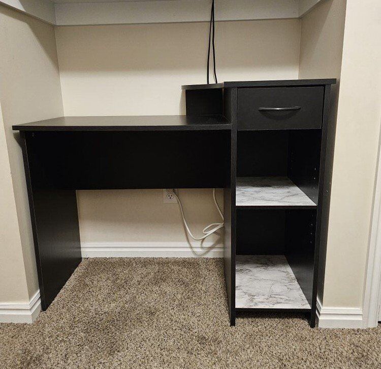 VenmoMainstay Black Desk in great condition. Shelves have Marble liner that can be taken off. My daughter changed her mind and wanted a desk all one level. See measurements in pictures.Asking $100 Cash or Venmo Only. Must pick up from West Jordan. If the listing is still up, it's available. Serious inquiries only.