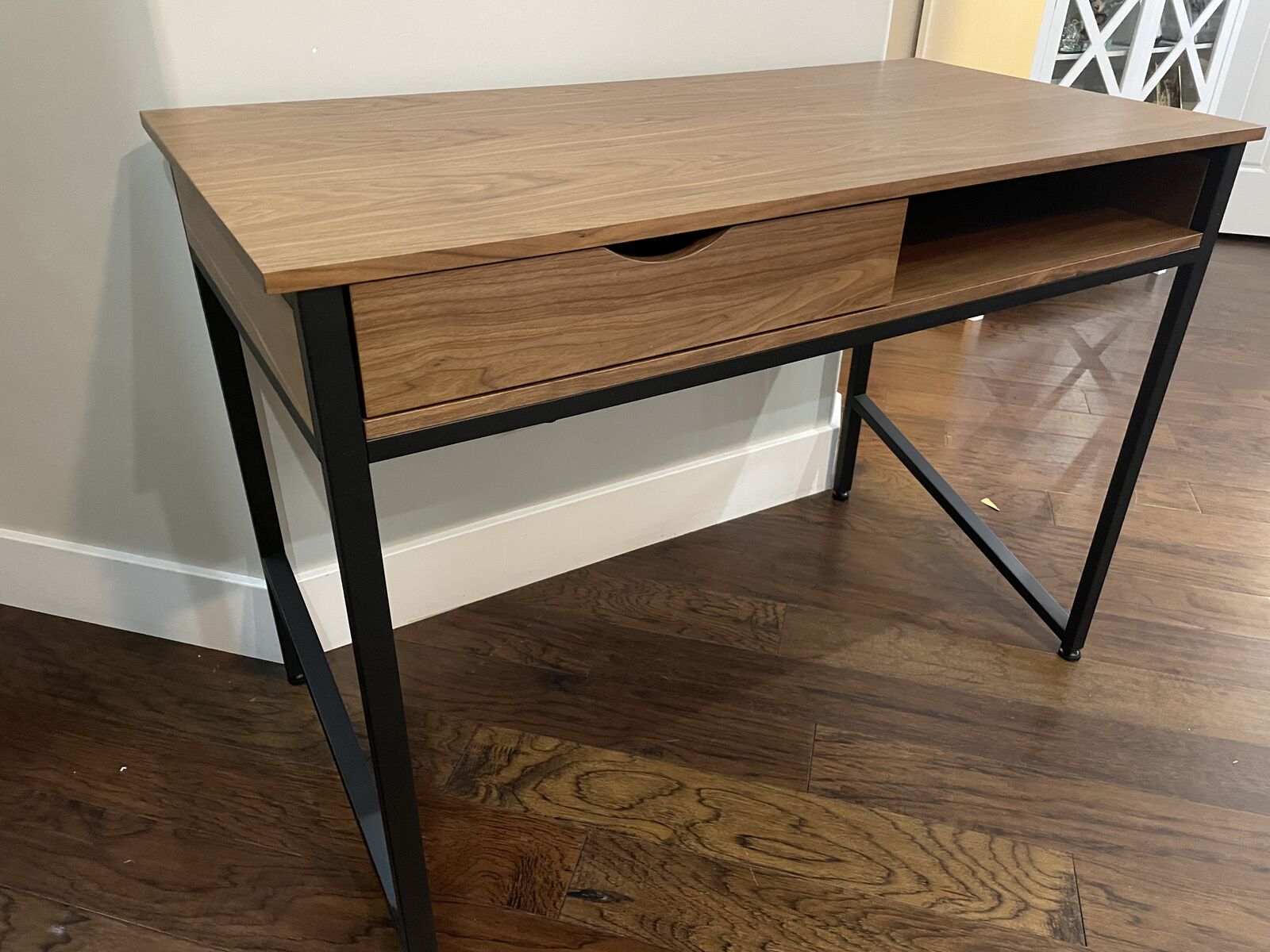 White frame with laminate top Contemporary leg design Drawer and built-in storage compartment Specifications: Maximum Depth (inches): 21.625 Maximum Height (inches): 30.75 Maximum Width (inches): 43.25 WOOD WRITING DESK: This studio writing workstation desk has has a beautiful natural wood laminate top DESK WITH DRAWER: This computer desk has a large working surface with a single drawer and extra cubby for storage HEAVY DUTY: This small desk is made from durable steel construction and is powder coated for a sleek finish USE WITH LAPTOPS: This writing station is the perfect size to work with laptops and personal tablets One drawer. Unlimited possibilities. Introducing the Safco Single Drawer Desk. With its contemporary styling, ample storage compartment and emphasis on streamlined functionality, this desk will be right at home in virtually any office, dorm or home