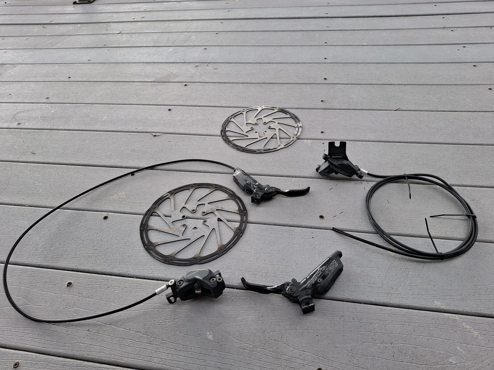 VenmoSRAM Code R front and rear brakes for sale. The rear brakeline is cut, it was on a medium DH bike. They don't look the nicest but they work great. I can throw in an extra set of brake pads for you. I am selling them because I upgraded to Mavens. Comes with two 200mm Centerline rotors.