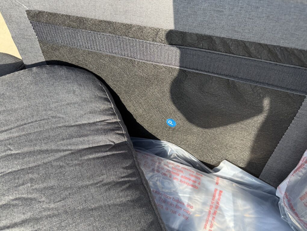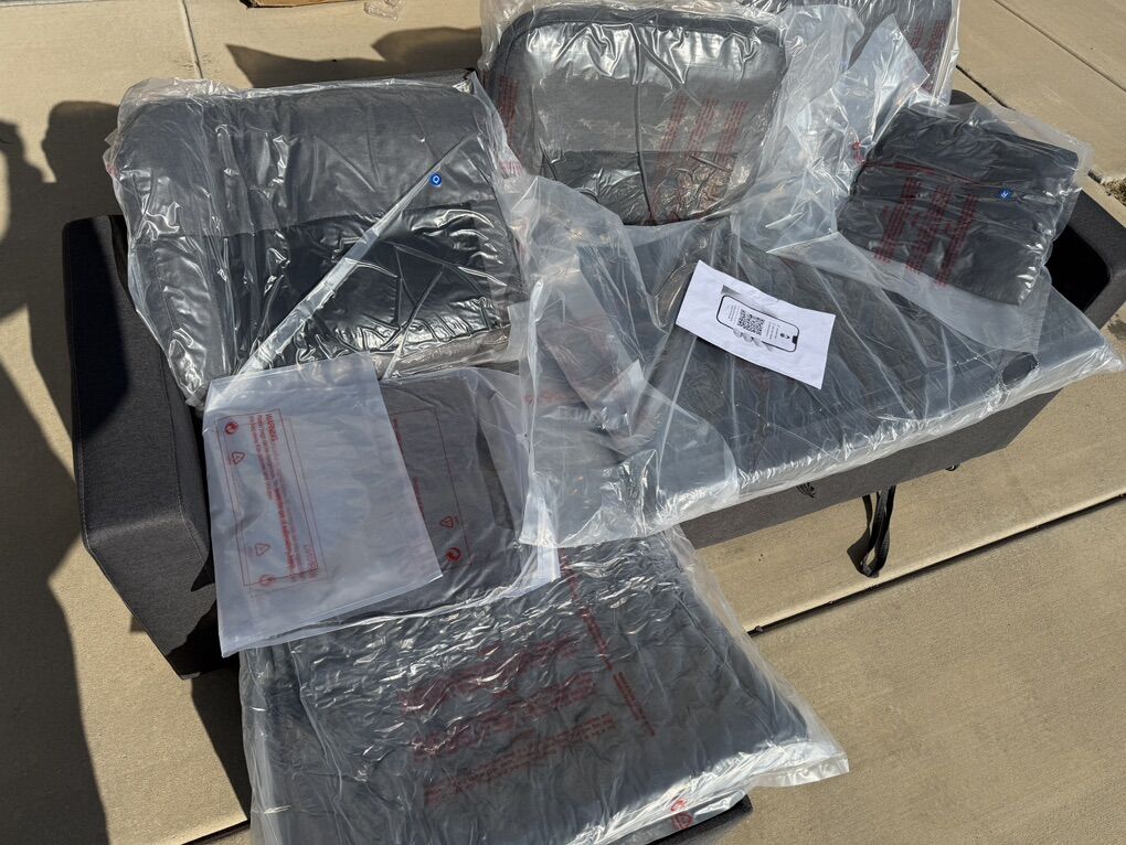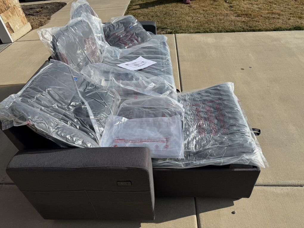 ApplePayNew still in plastic Comfy sofa sleeper couch Grey with white stitching Super cute functional Get it for a game room or an extra couch or even in the living room. Has a pullout bed with a storage and lounge. The storage is spring loaded and the pullout pad glides on wheels. Features usb and usbc on the side as well as reading pockets