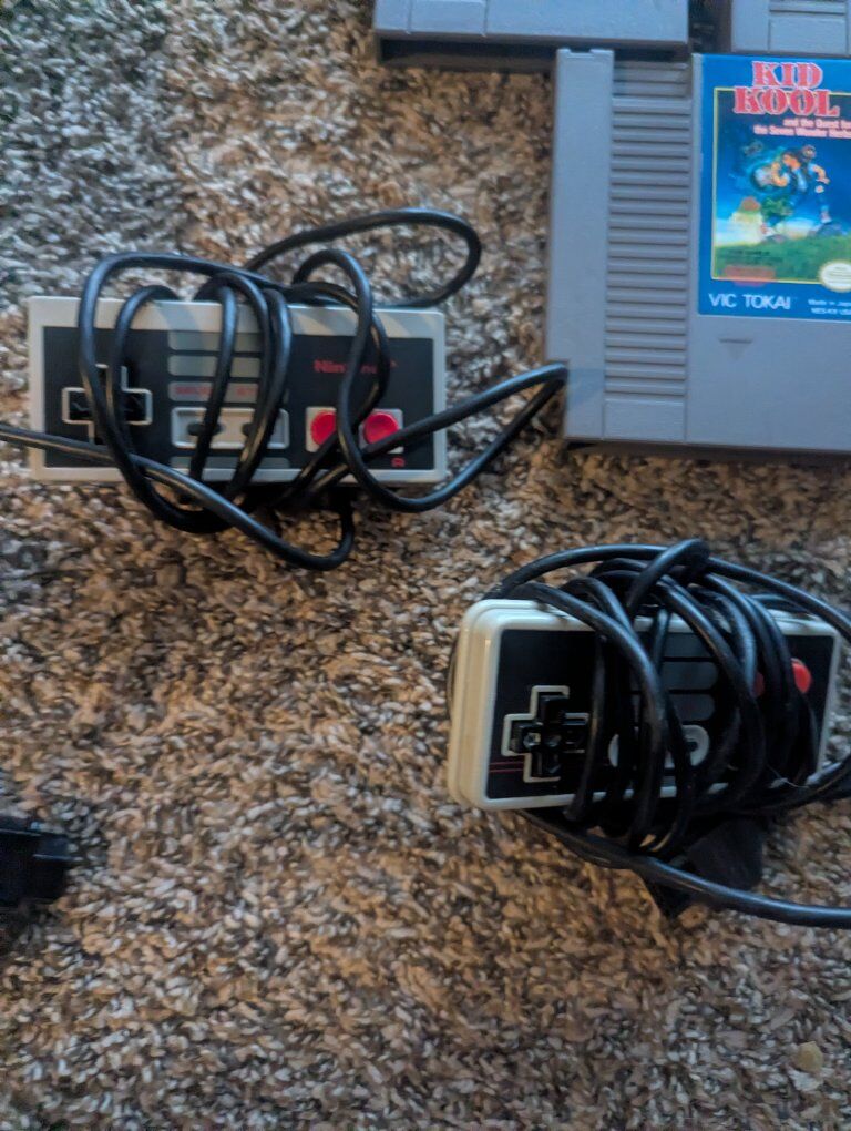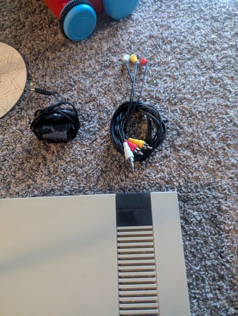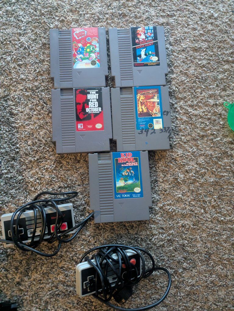 Nintendo nes with 2 controllers(1 oem, 1 third party) av cables and power plug. 5 games
