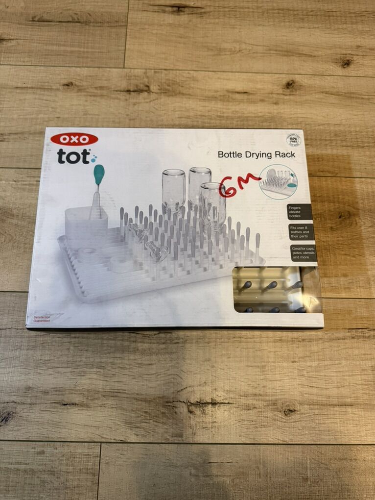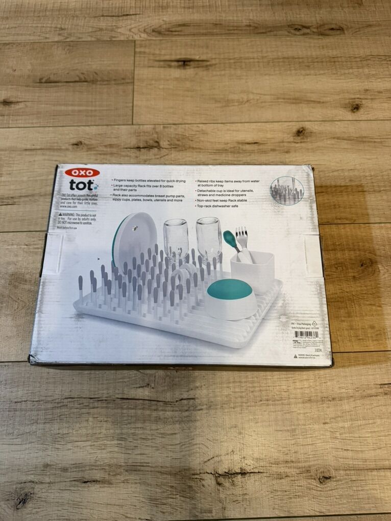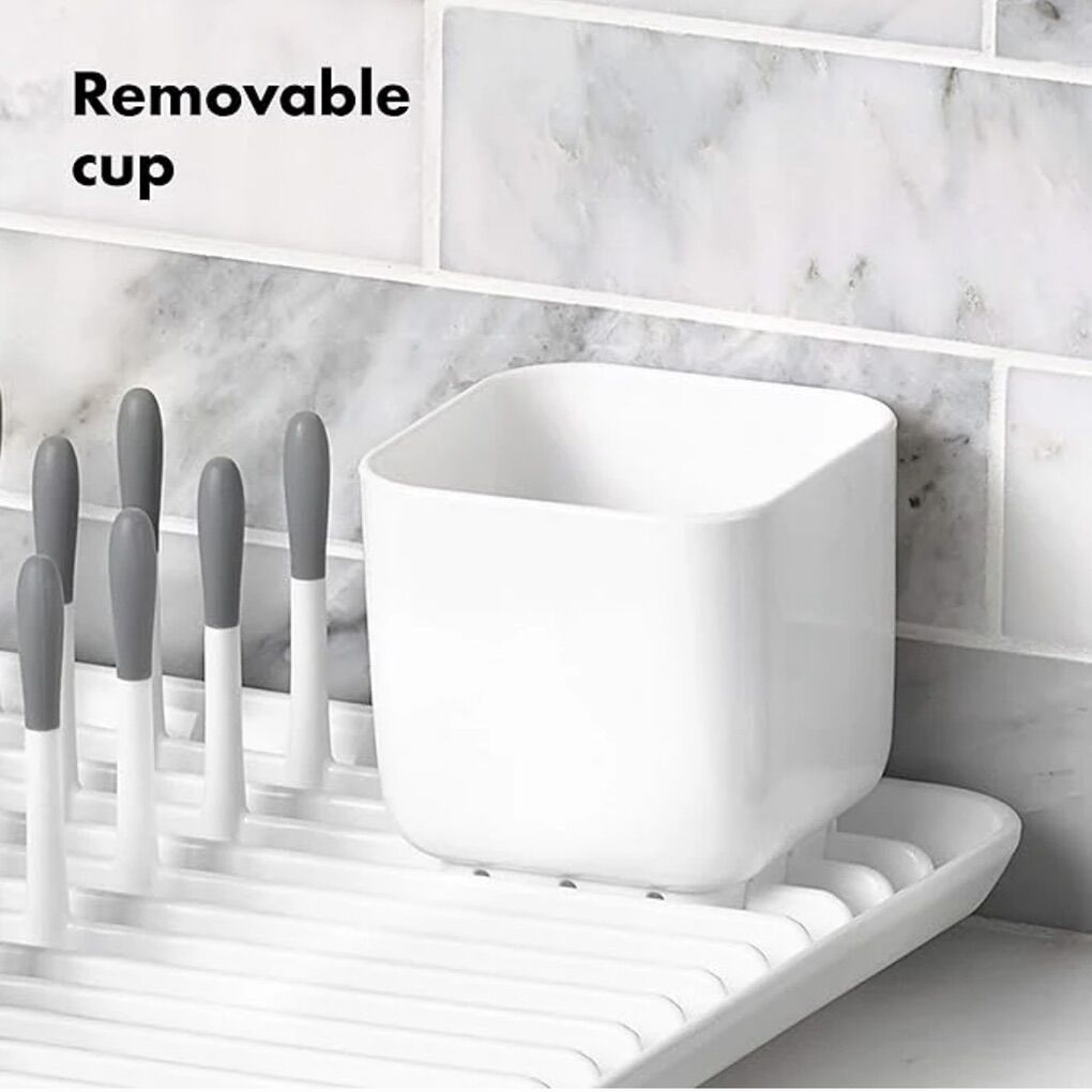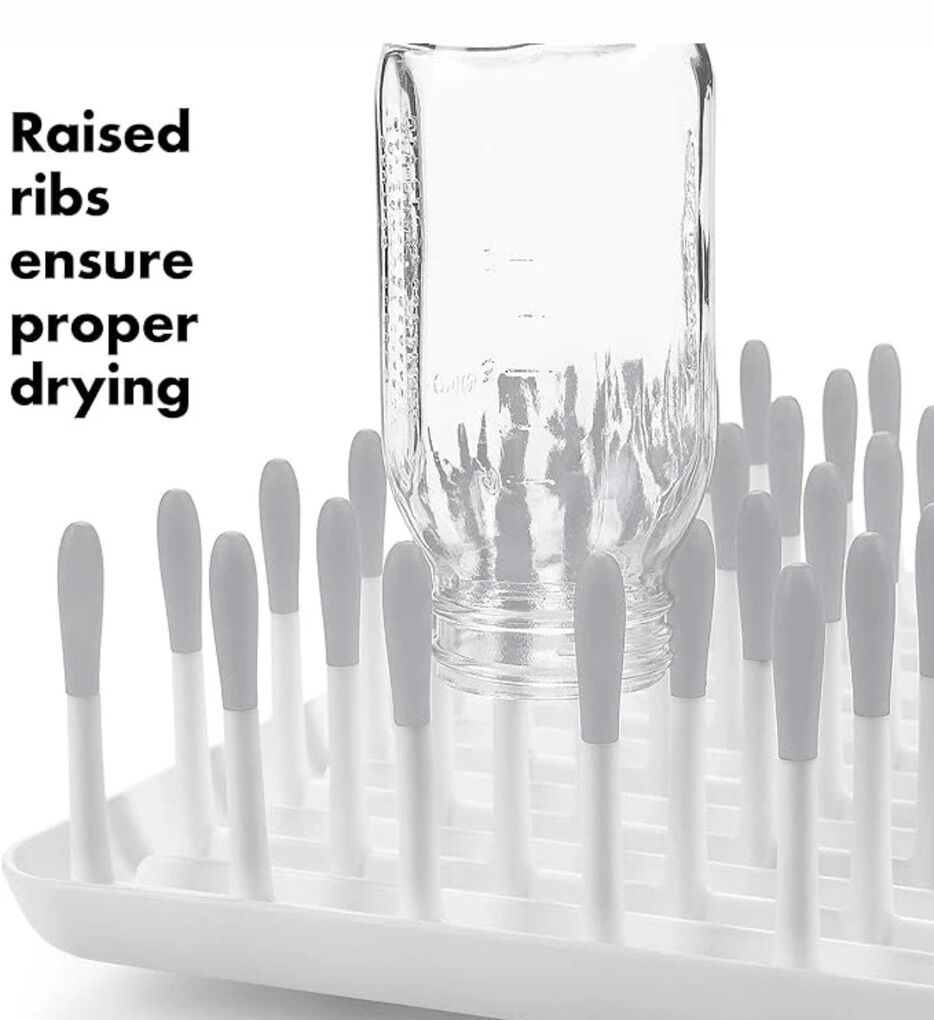 Items set out to dry don’t have to sit in a pool of water, thanks to the raised ribs on the bottom of the Bottle Drying Rack. Additional space at the front is useful for small parts. A removable cup, ideal for utensils, straws and medicine droppers, attaches in multiple places.