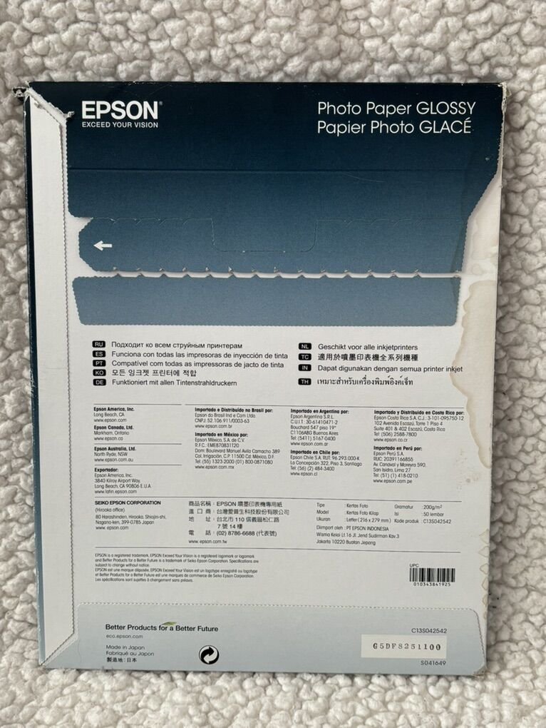 Epson Exceed Your Vision Glossy Photo Paper, 8.5 x 11 Inches, 49 Sheets per Pack, White Inkjet Photo printing: Great for vibrant, high-quality prints of personal photos. • Inkjet compatibility: Works with all inkjet printers for sharp images and fast drying. • Projects: Useful for crafting photo displays, scrapbooking, or DIY photo frames. No advance payment Payment and pick up Same TIME.