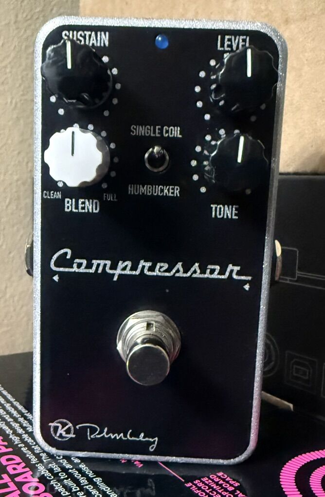 Blend knob (mixes dry signal with compressed), a Tone control (restores highs), and a Release switch (toggles between settings for single-coils or humbuckers) for enhanced versatility, adding an expander for more sustain