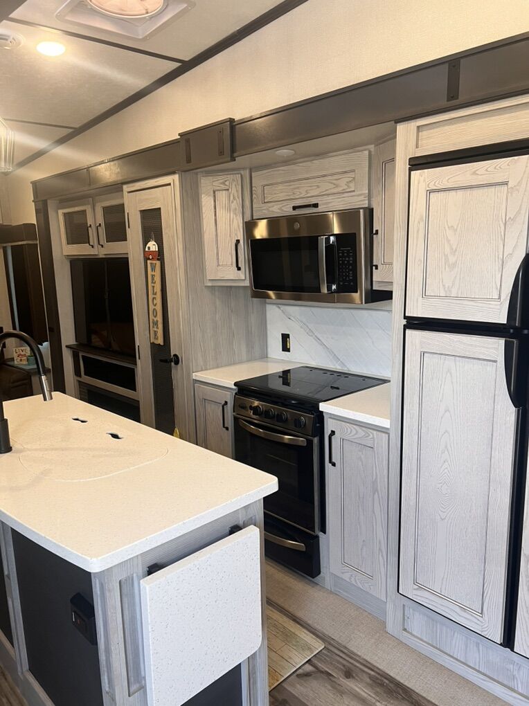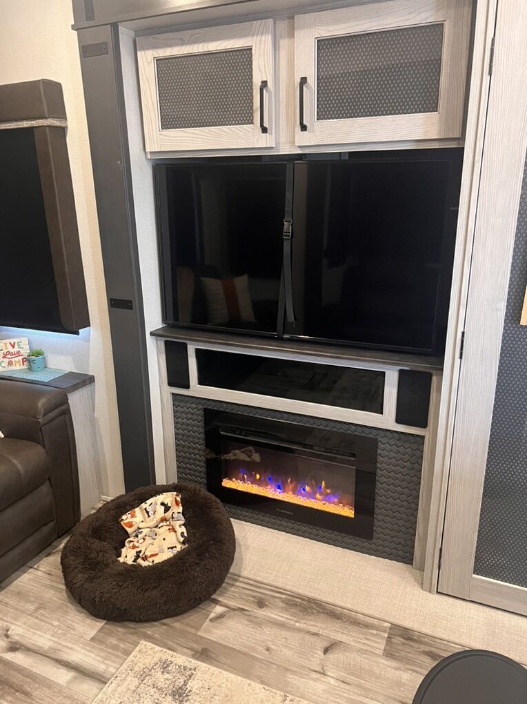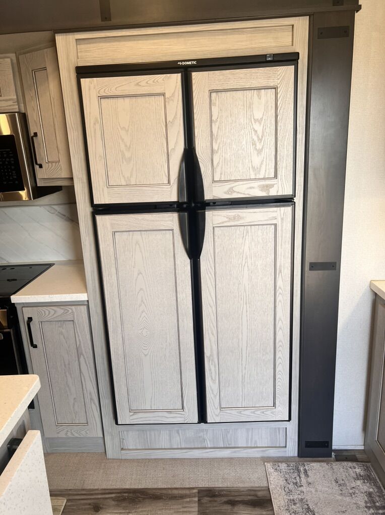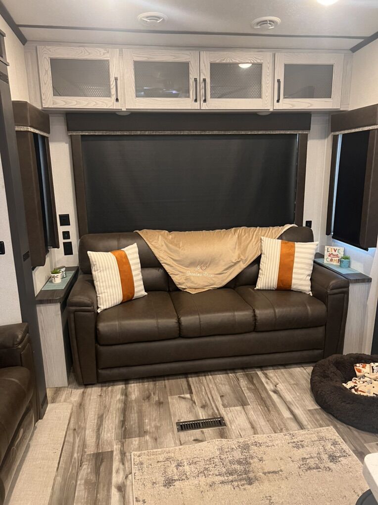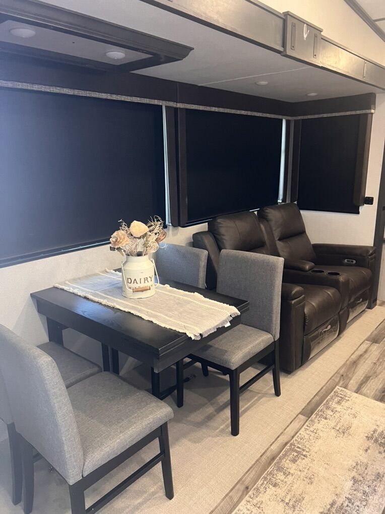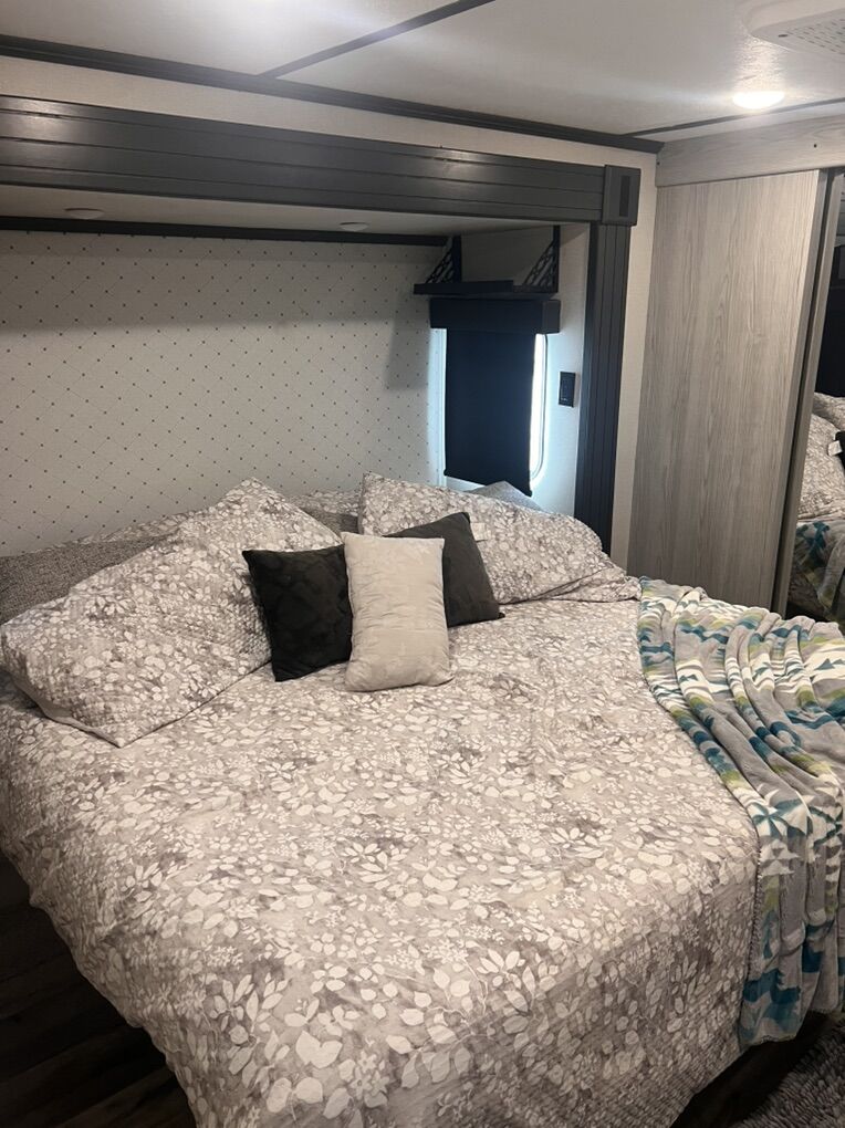 This trailer is absolutely beautiful, very well taken care of. King size bed, duel bathroom sinks with walk in shower, onboard vacuum, full size fridge, electric recliners and tons of storage and so much more.