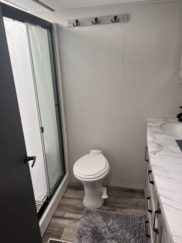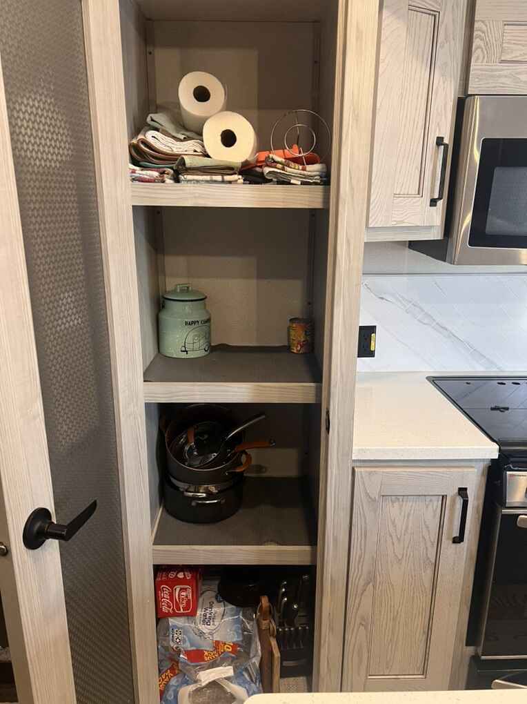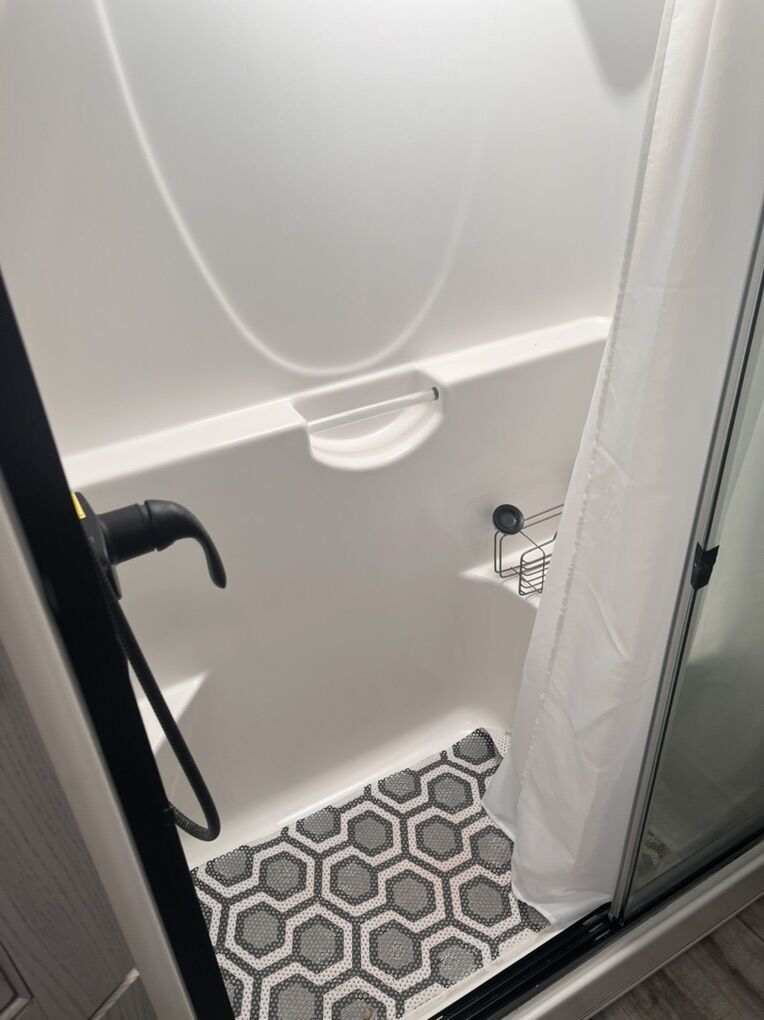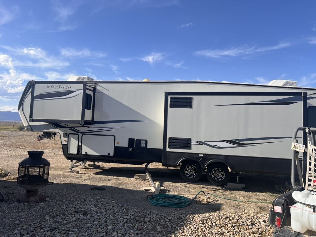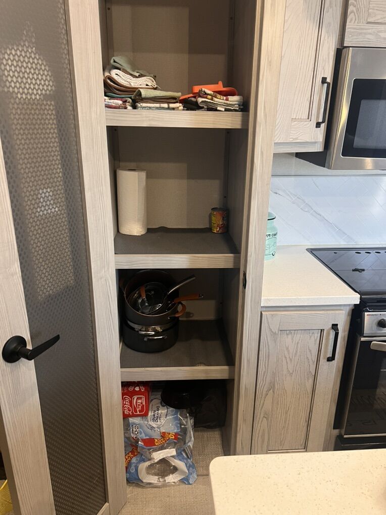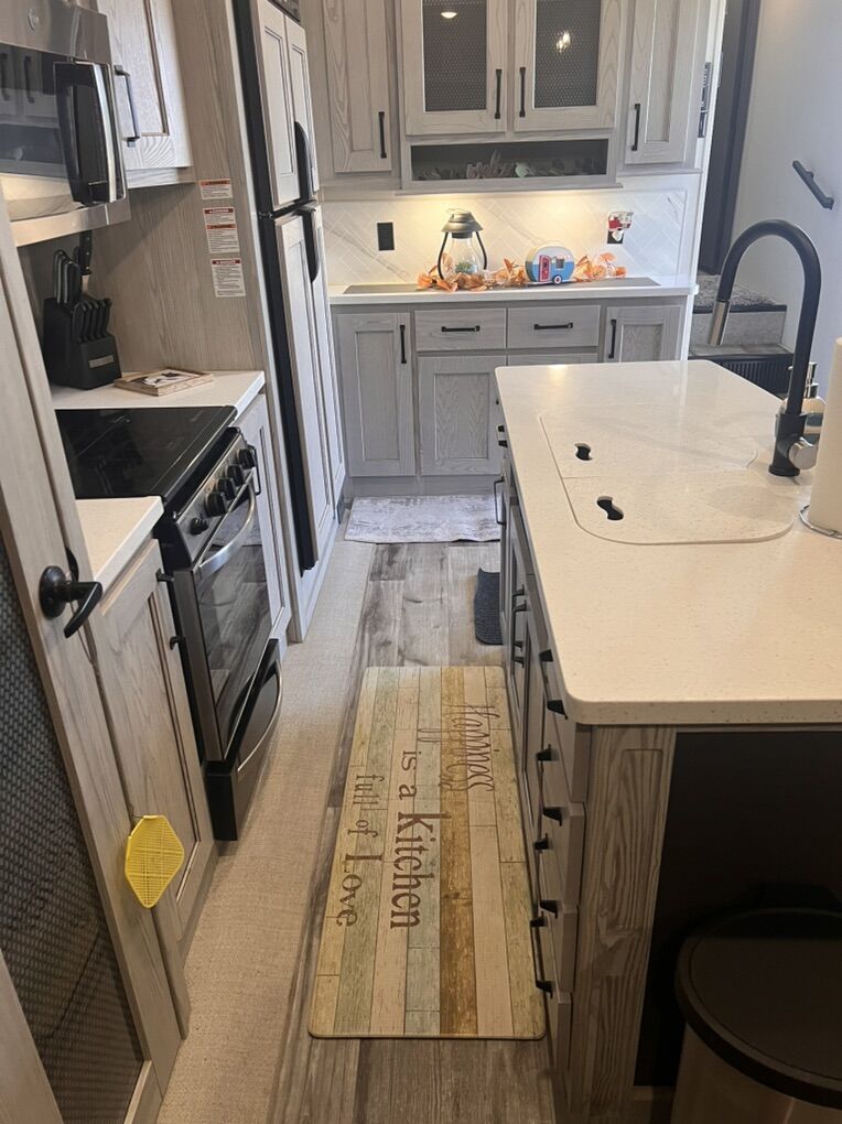 This trailer is absolutely beautiful, very well taken care of. King size bed, duel bathroom sinks with walk in shower, onboard vacuum, full size fridge, electric recliners and tons of storage and so much more.