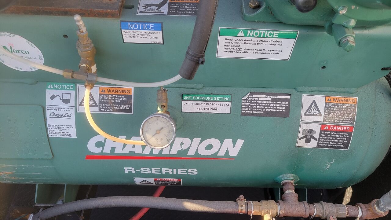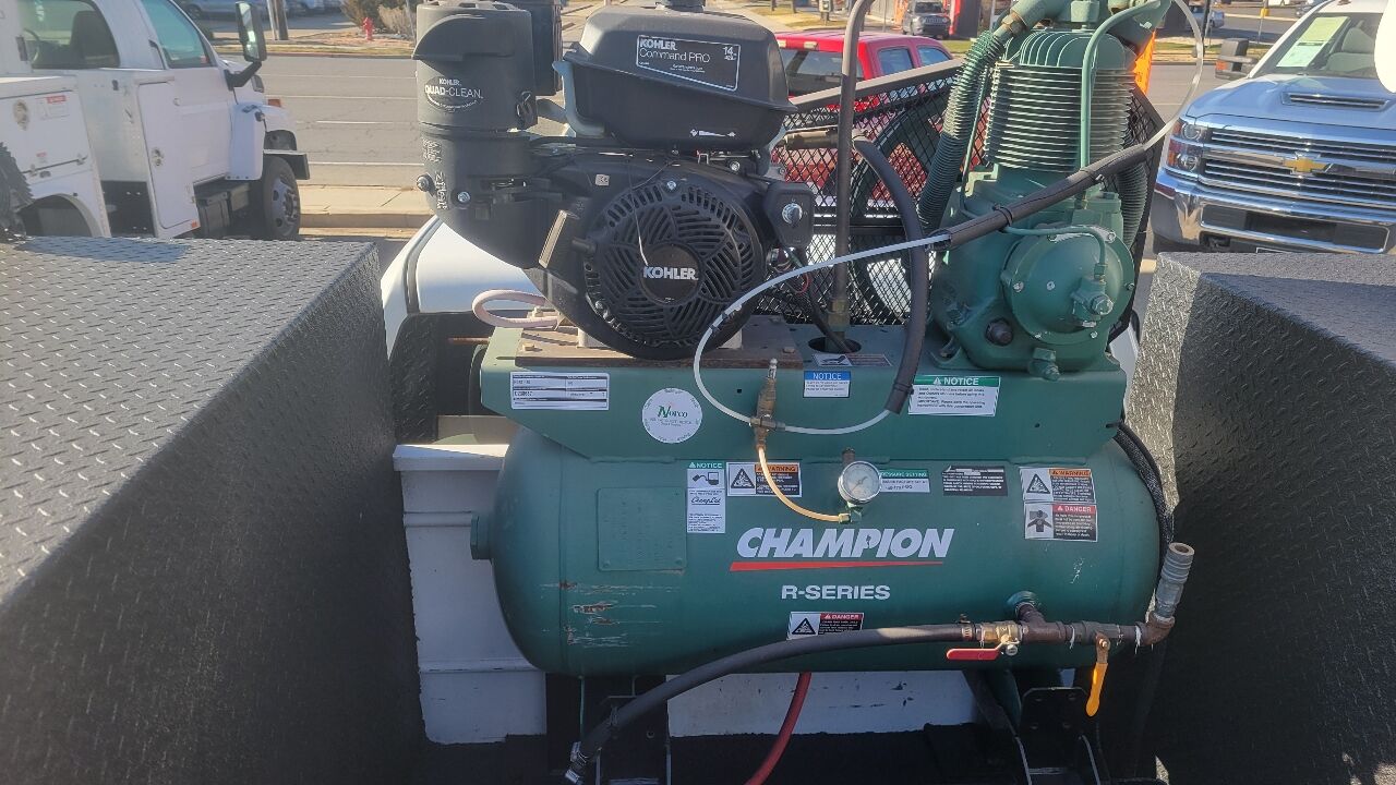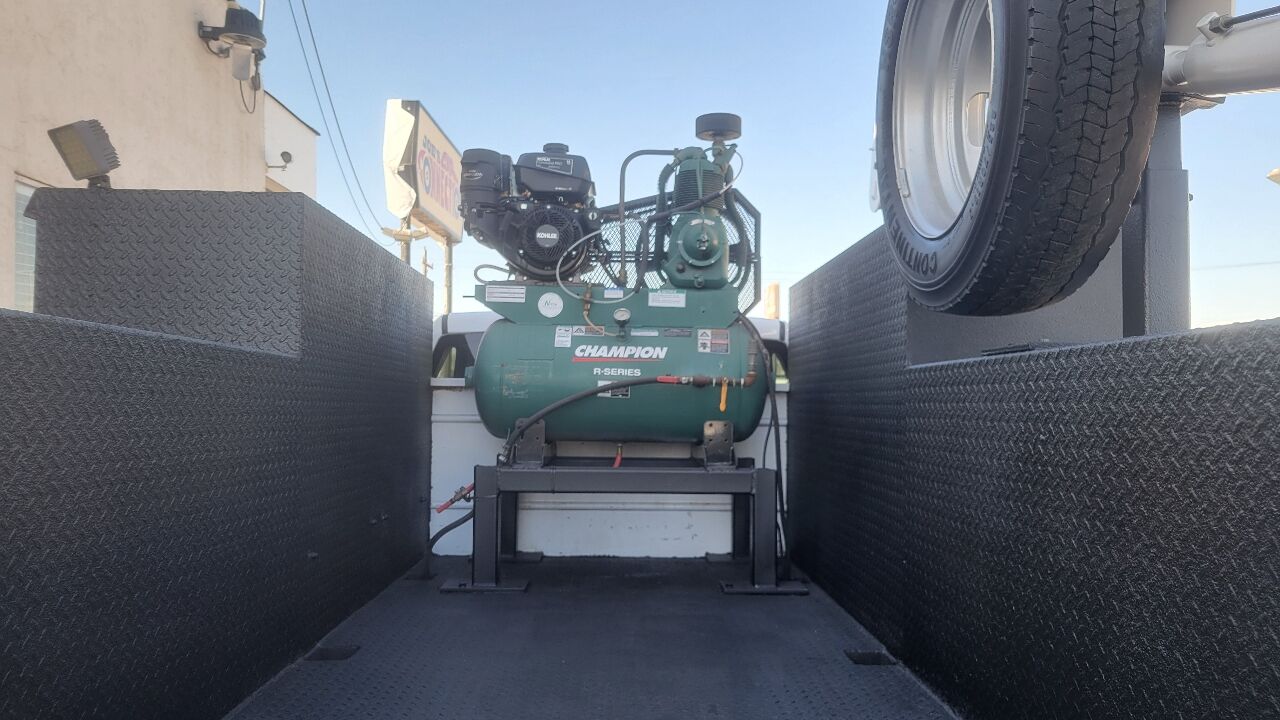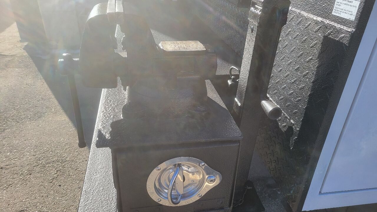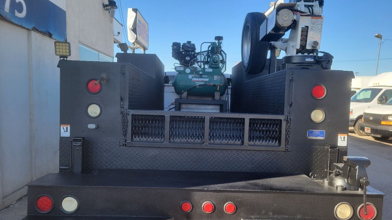 COMPRESSOR. REEL, TOOL BINS, WORK BUMPER, VICE. LIGHTS.