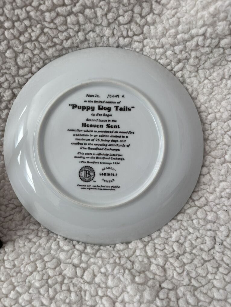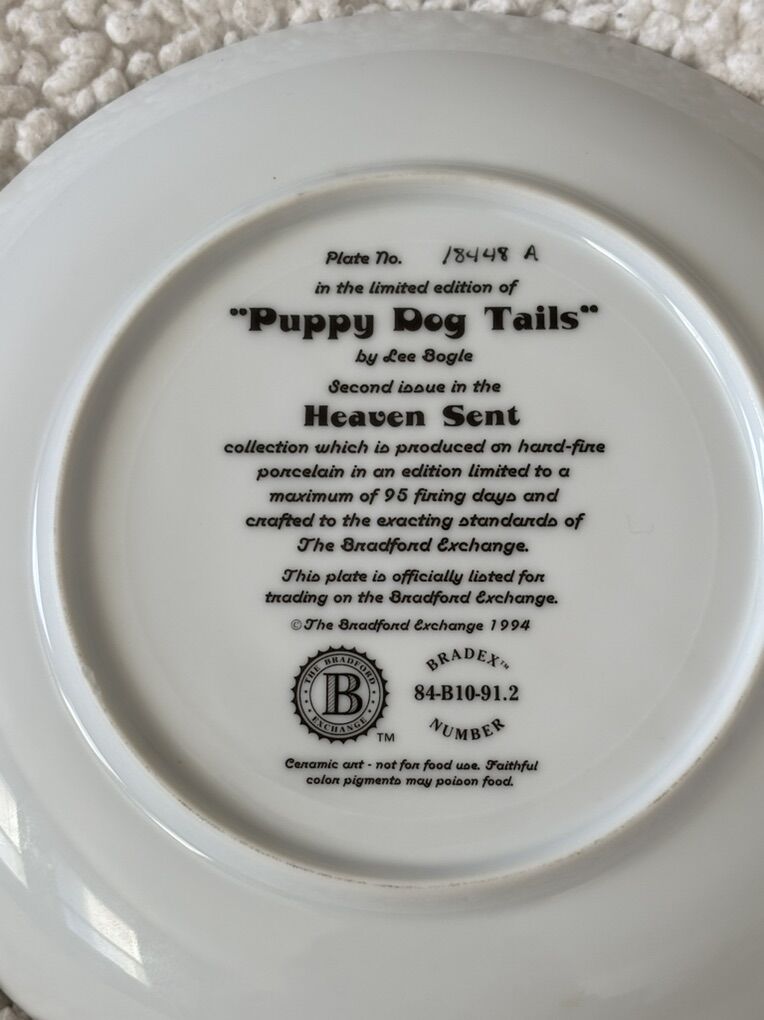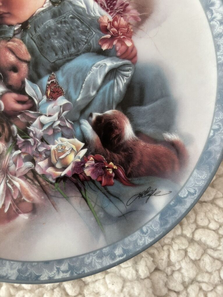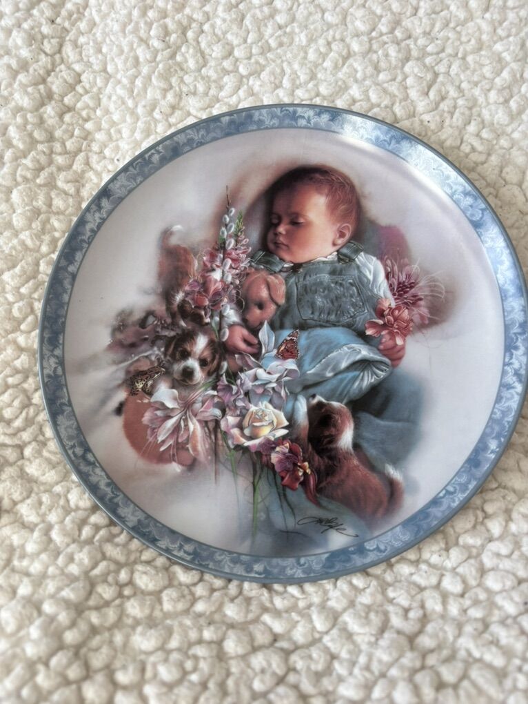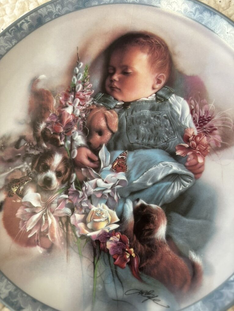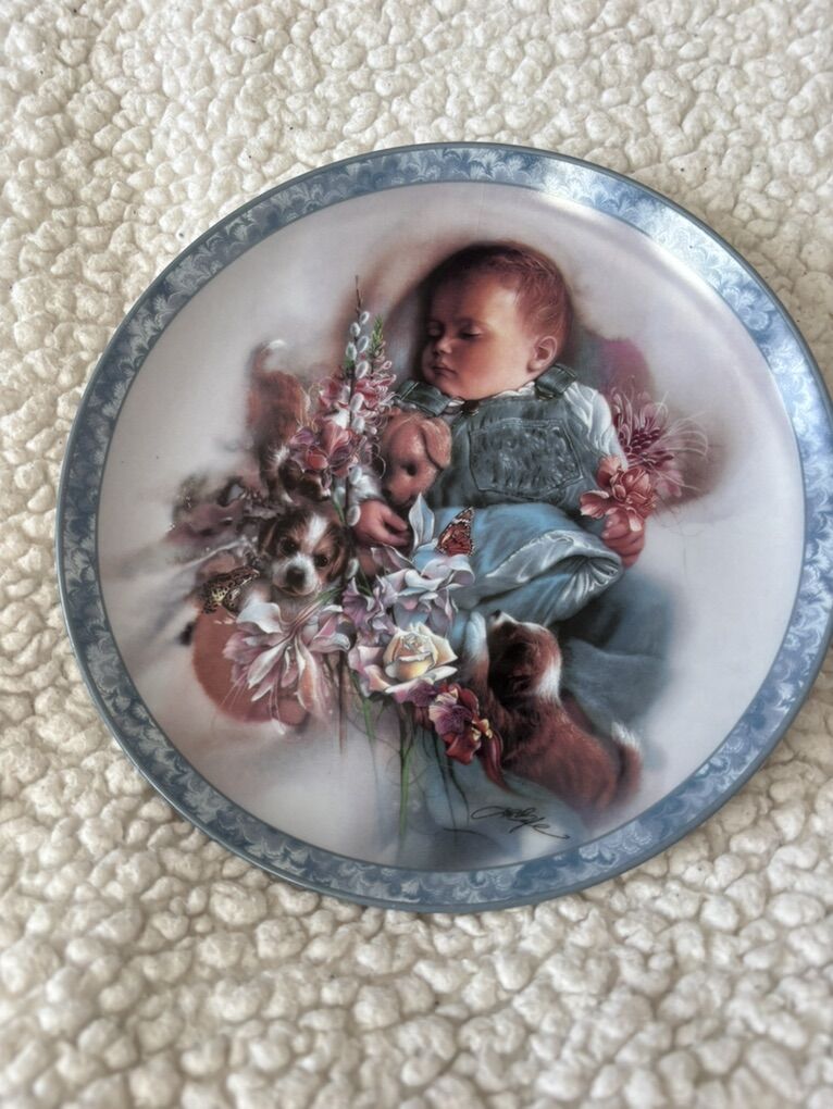 The “puppy dog tails” plate is a decorative porcelain plate that features a painted scene of a sleeping baby dressed in blue overalls, holding pink flowers and surrounded by two small brown-and-white puppies and additional floral accents. The plate has a white center with a blue-gray ornamental border. There is a hair line crack on the back on the plate. Dimensions roughly: 8.25” No advance payment Payment and pick are at the SAME time.