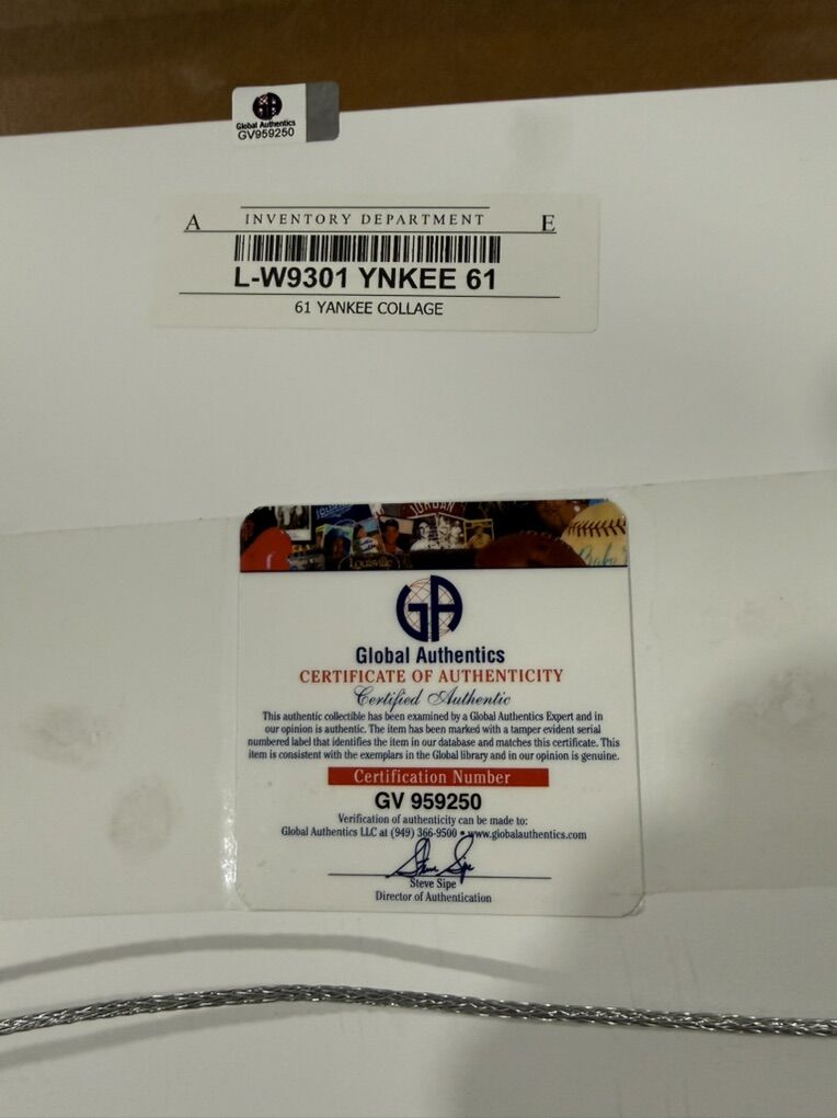 1961 New York Yankees (World Champions) signature collage. Twenty-six signatures including: Luis Arroyo, Yogi Berra, Johnny Blanchard, Clete Boyer, Tex Clevenger, Jim Coates, Bud Daley, Joe DeMaestri, Art Ditmar, Ryne Duran, Whitey Ford, Bob Hale, Ralph Houk, Elston Howard, Tony Kubek, Hector Lopez, Mickey Mantle, Roger Maris, Hal Reniff, Bobby Richardson, Johnny Sain, Rollie Sheldon, Bill Skowron, Ralph Terry, Tom Tresh, and Bob Turley. This authentic collectible was examined by the Global Authentics team of experts.