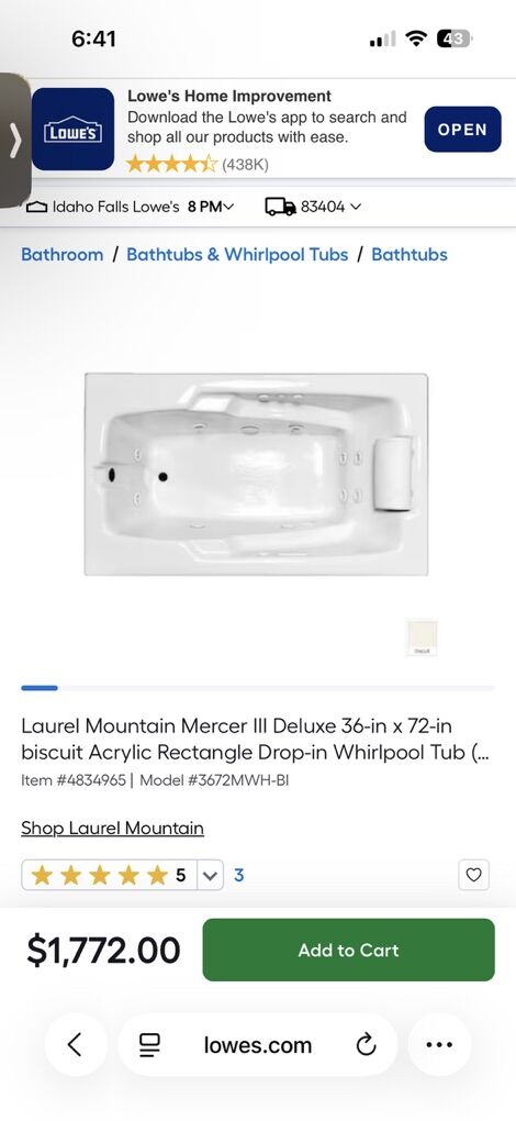 ApplePayLaurel Mountain Mercer III Deluxe 36-in x 72-in biscuit Acrylic Rectangle Drop-in Whirlpool Tub. Purchased from Lowe’s for $1700. This has never been used. We are moving and now have no need for it. Asking $1200 OBO we are moving and would love to sell ASAP