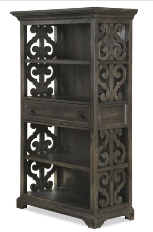 VenmoBellamy Collection by Magnussen Furniture • Peppercorn finish • Made up of pine veneers and solids • Matte Black with pewter highlights hardware Top: • 8 Mail slots on 2 sides • 3 Felt lined drawers in the center top • Tinted drawers with English dovetail in front and English in back • Side mount ball bearing guides • Sealed for dust proofing Base: • 2 Felt lined drawers on top sides • 1 Drop down drawer front in the center • 2 Wood doors at the bottom sides • 1 Adjustable wood shelf behind each door • Tinted drawers with English dovetail in front and English in back • Side mount ball bearing guides • Removable mouse tray and pencil tray can be used left and right • Wire management • Levelers • Sealed for dust proofing • Dimensions: 51 H × 64 W × 30D