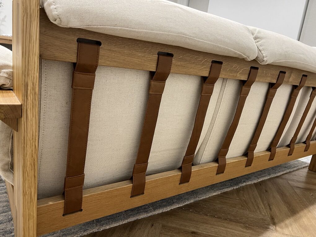 Handsome from every angle, the Shinola Runwell sofa shows off its own brand of clean-lined modernism inspired by traditional American woodworking. A frame of naturally finished solid white oak sets the stage with exposed joinery that showcases rectangles of end grain where the rails intersect the legs. Shelf-style armrests and a slotted deck enhance the sofa's linear design. Oversized cushions covered in naturally flecked cotton-linen fabric are tailored with dimple-creating pintucks and generously filled for sink-in-and-stay-awhile comfort. Designed to impress at any angle, the sofa features slats of padded leather that provide a peek at the back and seat construction, a demonstration of the craftsmanship and a modern mix of materials. The Shinola Runwell sofa is a Crate & Barrel exclusive.