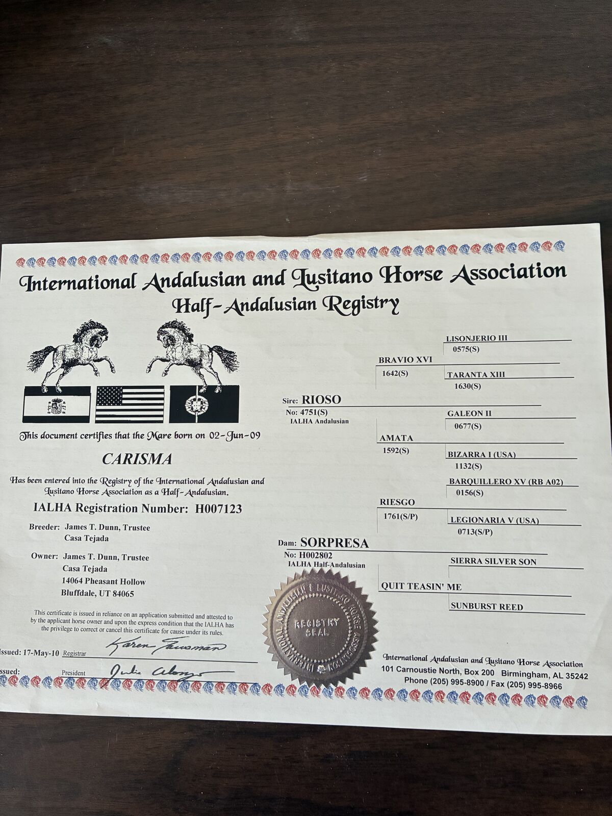 Registered 3/4 Andalusian broodmare. Approx. 15.1H and 1000 lbs. 2 of 10 temperament (calm) Great mom. Green broke to ride, but will need a tune up to be used as a saddle horse. Still good for a couple more foals. UC Davis tested for red gene. Microchipped. Can throw black or bay foals. UTD on trims, deworming and vaccinations. Easy keeper. Loads in the trailer. Stands still for farrier and vet. No bad habits. Bred here at our place and imprint trained at birth. I am retired and disabled and she is not being used. Put her under lights and breed for an early spring foal next year.
