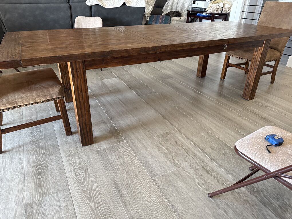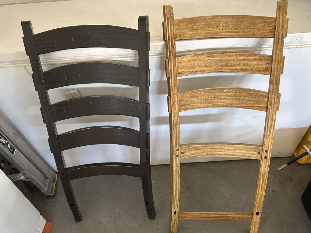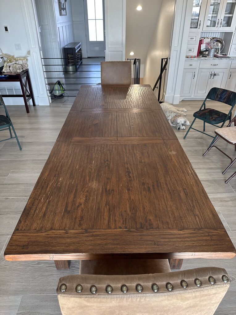 PayPalI have a beautiful table and chairs that I thought I could refinish to be darker on my own. I realized that I do not have the patience, but not before I started to take apart and strip all the chairs. I have all the project supplies and have one chair back stained if someone wants to take the project on. Otherwise, it would probably be much easier to paint it. I’ve seen my exact table in KSL for 1,500 recently. I’ll ask 1,000 OBO. It’s 41 inches wide. With the awesome butterfly leaf that you can do with one person, it extends from 84 inches to about 112 inches. It is 30 1/4 inches from the ground to the top. I have two chairs that aren’t taken apart because they weren’t the ladder style. They are in the photo with the table. There’s 6 regular height ladder chairs, the two in the video, and 4 barstools.
