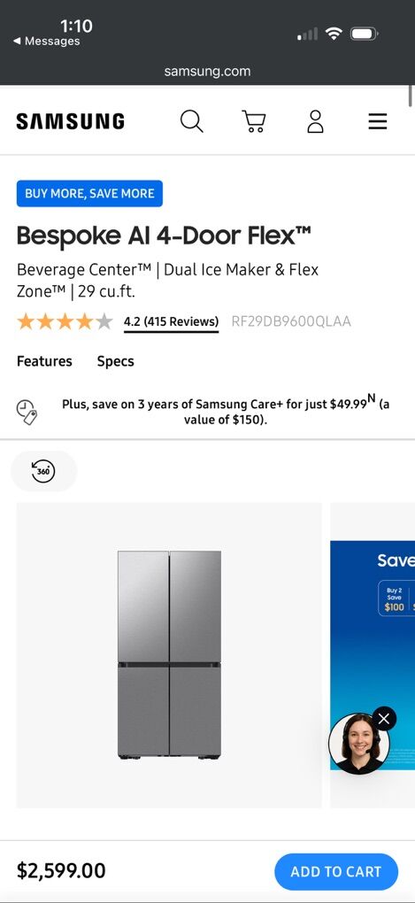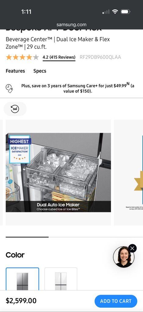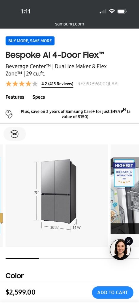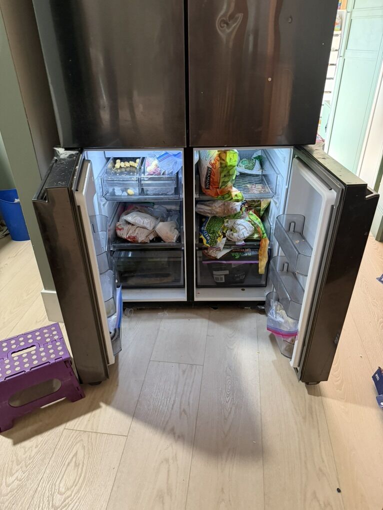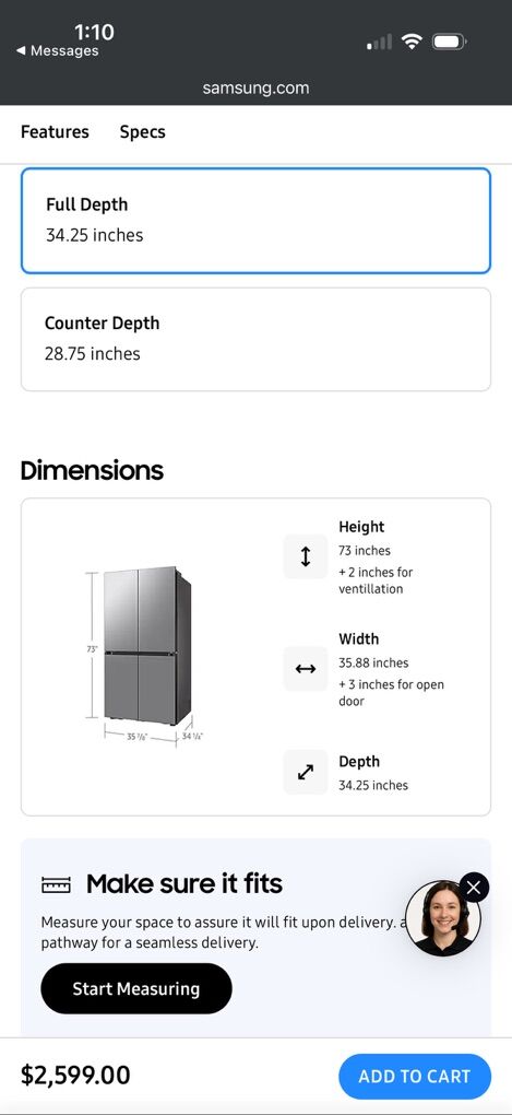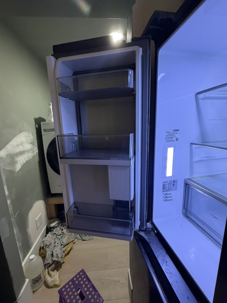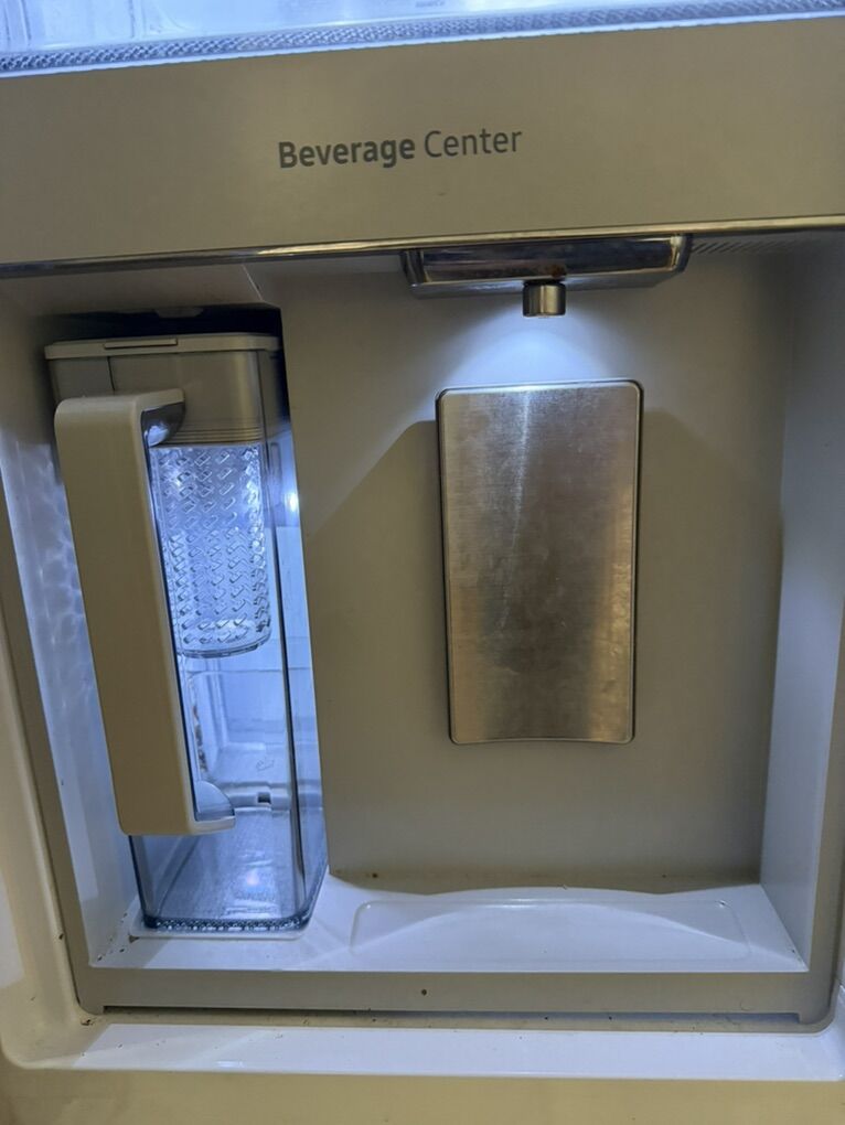 Purchased 5 years ago, still under warranty. We’ve never had any issues with it, we love this fridge! We love it so much that we purchased the exact same fridge for our remodel, only counter depth. This fridge is not counter depth - see photos for dimensions. It fits so much! Our favorite features are the drink hub and the icemaker! They are so convenient!
