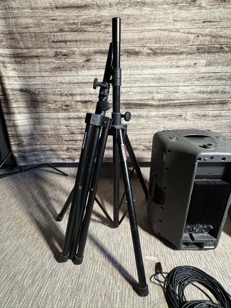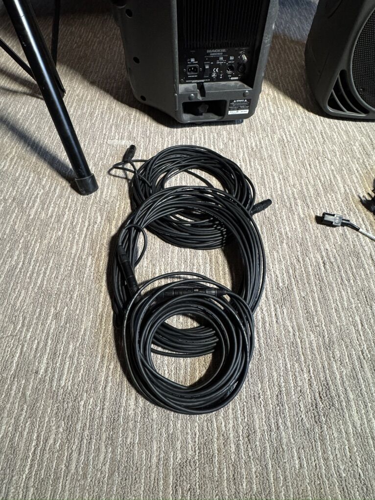 Comes with two proline stands, 3 power cables, and 3 xlr cables.