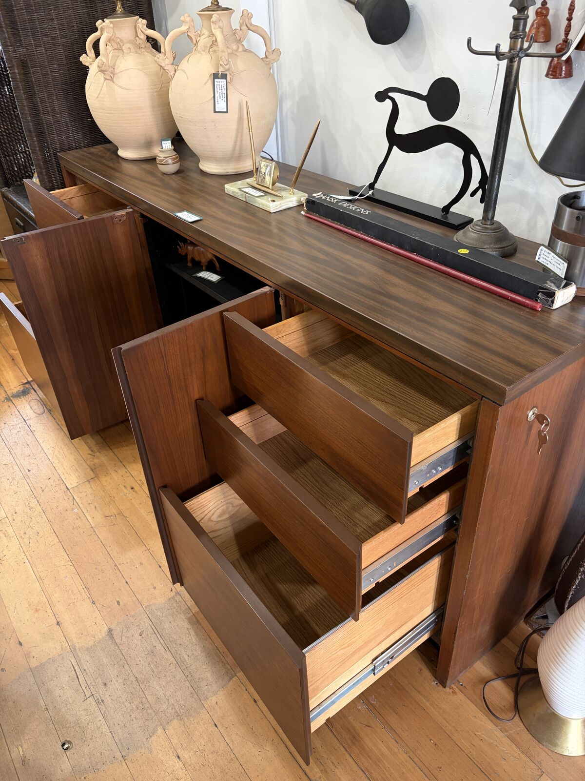 CashAppMCM Lehigh Leopold Walnut Credenza Has a working key & locking mechanism.