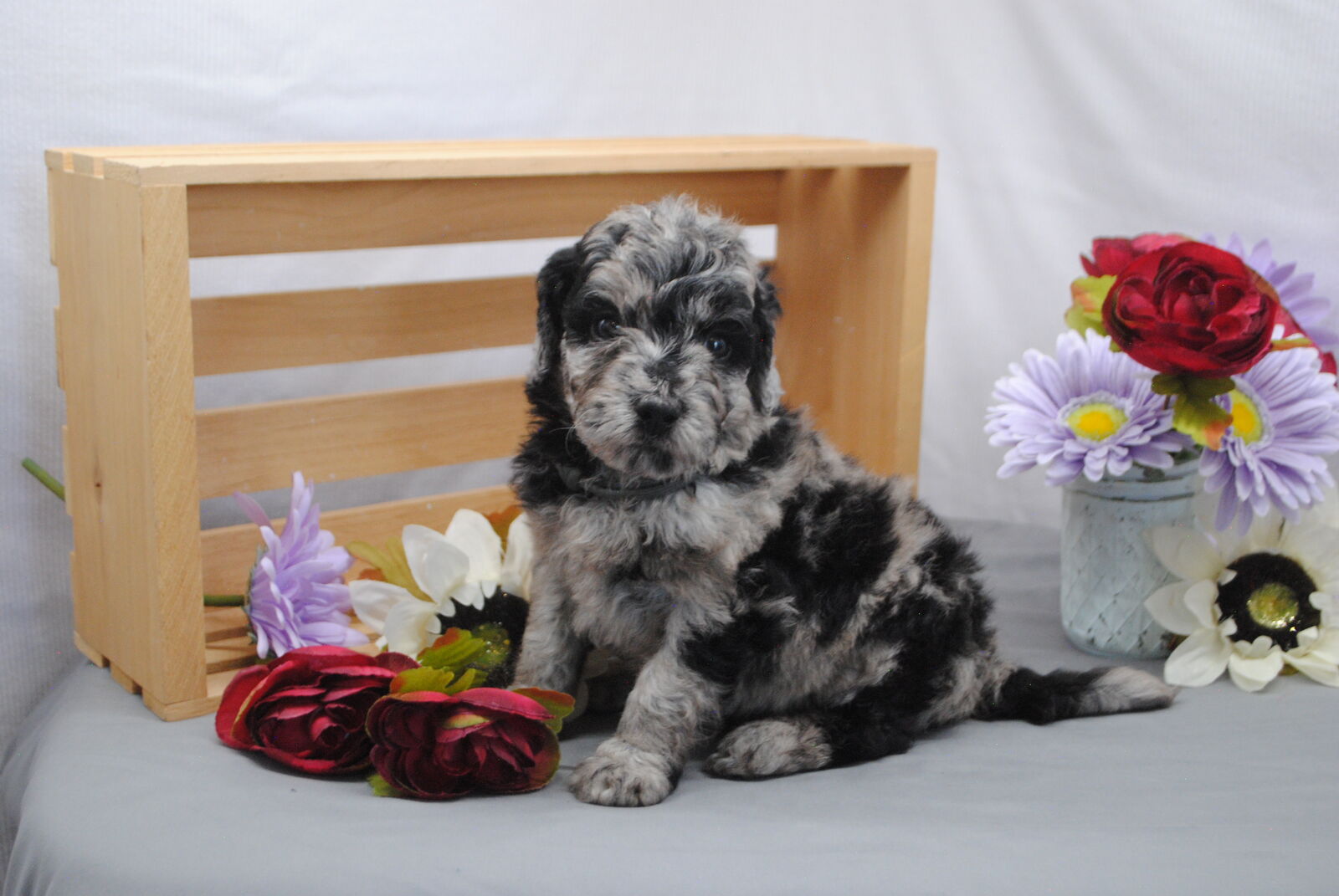 Calm and quiet temperament, full of doodle love without too much doodle energy. He is loving and sweet, friendly to all! Never afraid of new things, adaptable, and intelligent. Many of his babies go on to be therapy dogs or service dogs. Great conformation and body structure (no short legs).