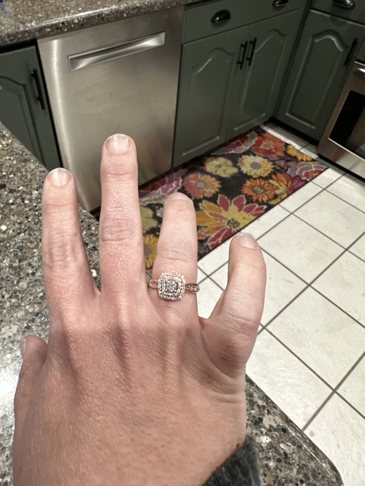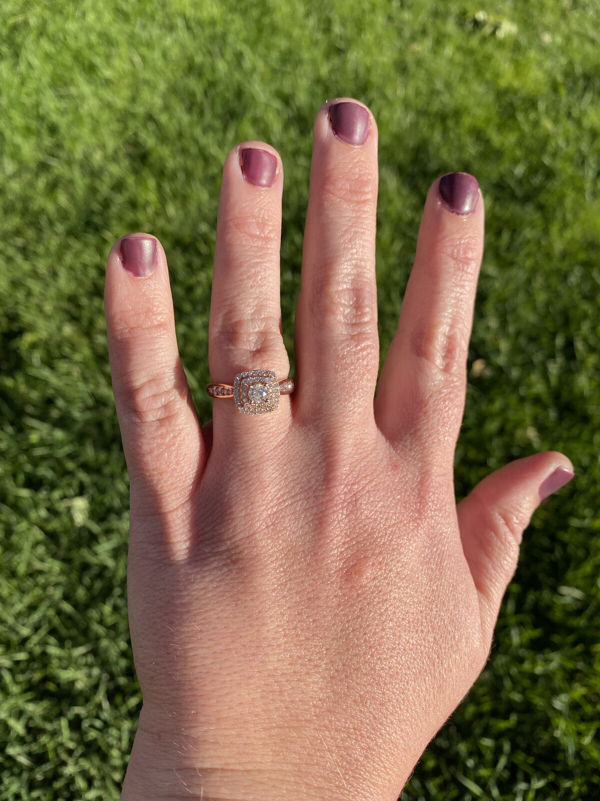 Details • Total Diamond Weight: 7/8 CTW • Center Diamond: 1/3 CT, round • Natural diamonds throughout • Color: I | Clarity: I2 • Prong-set halo and band • Ring Size: 8 • Metal: 14K Rose Gold