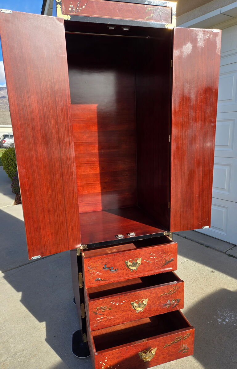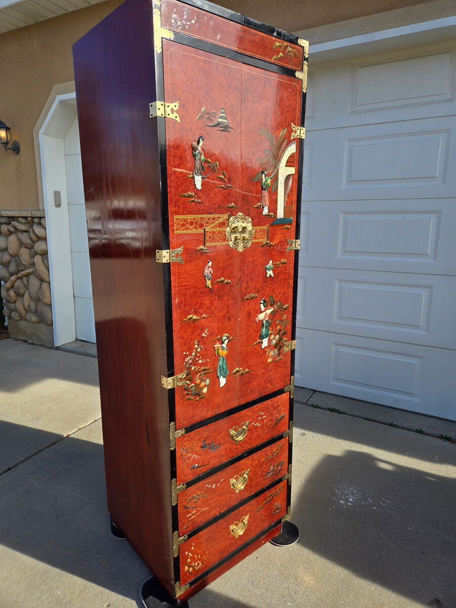 CashAppRare find, red Laquer Chinese Bridal armoire. Beautiful detail with three dimensional characters. Non-smoking home. Normal scuffs for age. Pick up in South weber. Will hold and Mark as sold with a $50 venmo deposit. Delivery possible with fee.